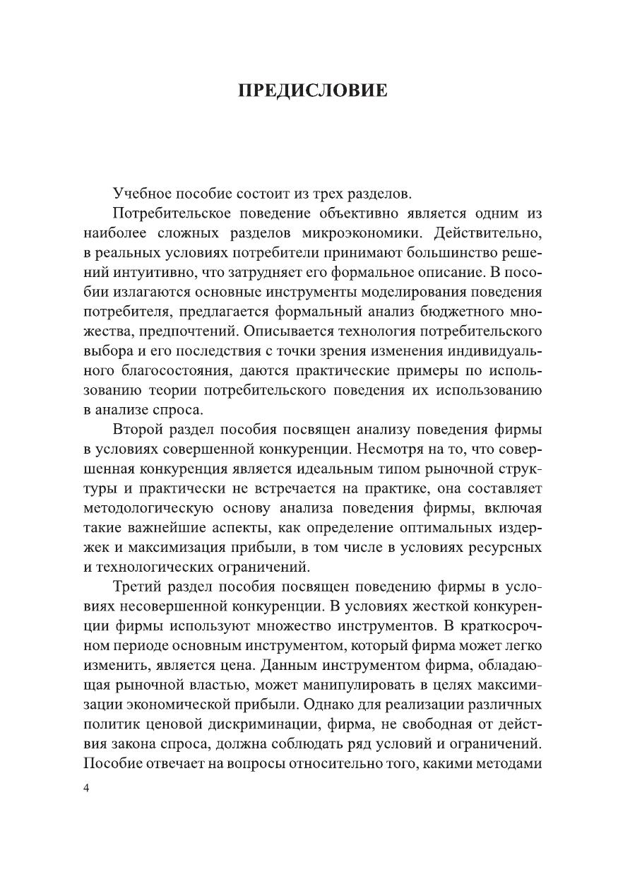 В пособии дан анализ потребительского поведения, рассмотрено поведение фирмы в условиях совершенной конкуренции, показаны инструменты анализа поведения фирмы в условиях несовершенной конкуренции. Приведены формальные доказательства основных выводов микроэкономической теории, раскрывается связь базовых моделей с практикой. Теоретический материал дополнен задачами для самостоятельного решения.