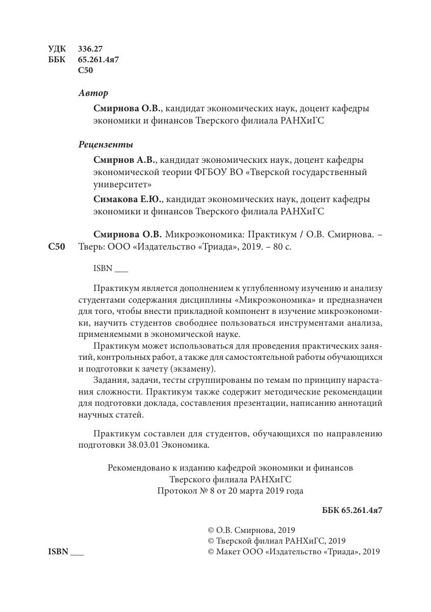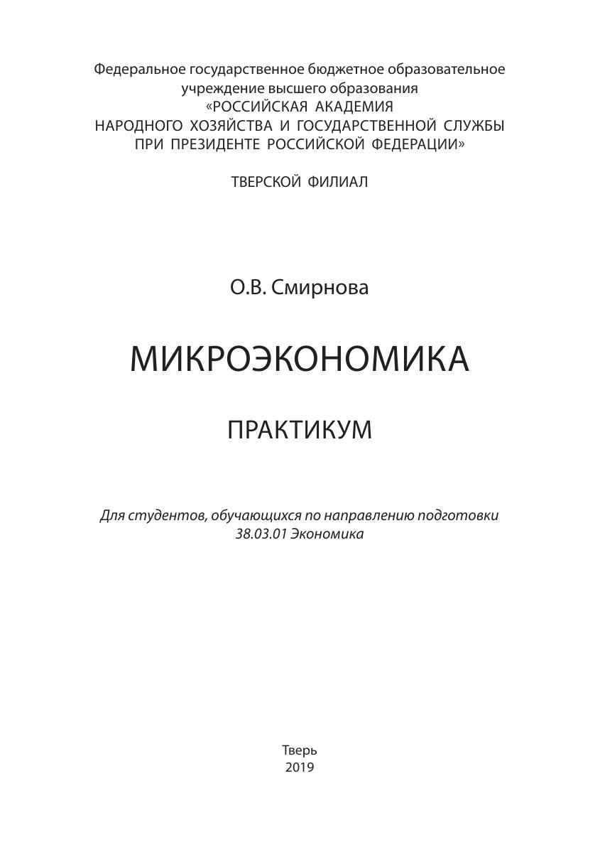 Практикум является дополнением к углубленному изучению и анализу студентами содержания дисциплины «Микроэкономика» и предназначен для того, чтобы внести прикладной компонент в изучение микроэкономики, научить студентов свободнее пользоваться инструментами анализа, применяемыми в экономической науке. Практикум может использоваться для проведения практических занятий, контрольных работ, а также для самостоятельной работы обучающихся и подготовки к зачету (экзамену). Задания, задачи, тесты сгруппированы по темам по принципу нарастания сложности. Практикум также содержит методические рекомендации для подготовки доклада, составления презентации, написанию аннотаций научных статей. Практикум составлен для студентов, обучающихся по направлению подготовки 38.03.01 Экономика.