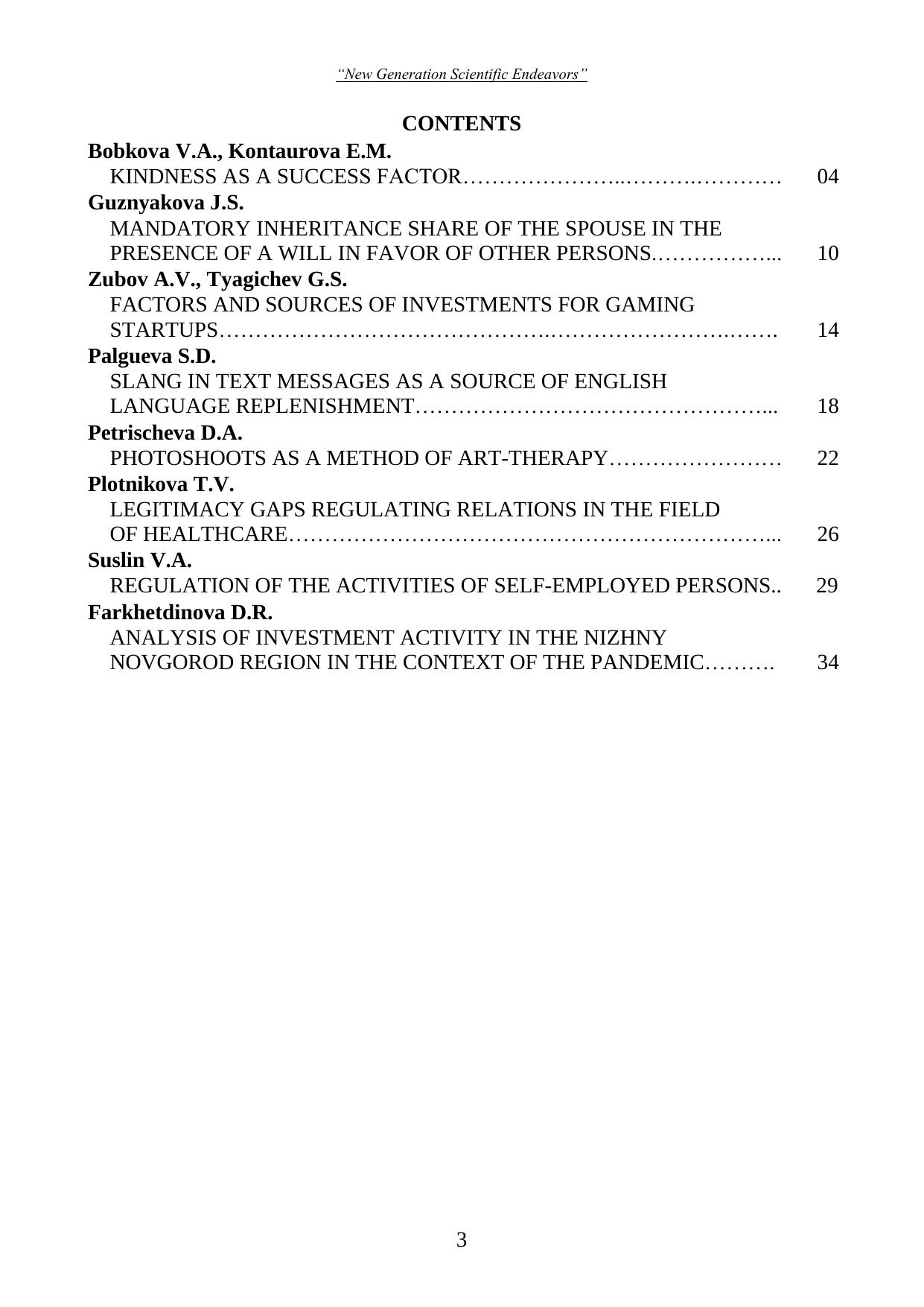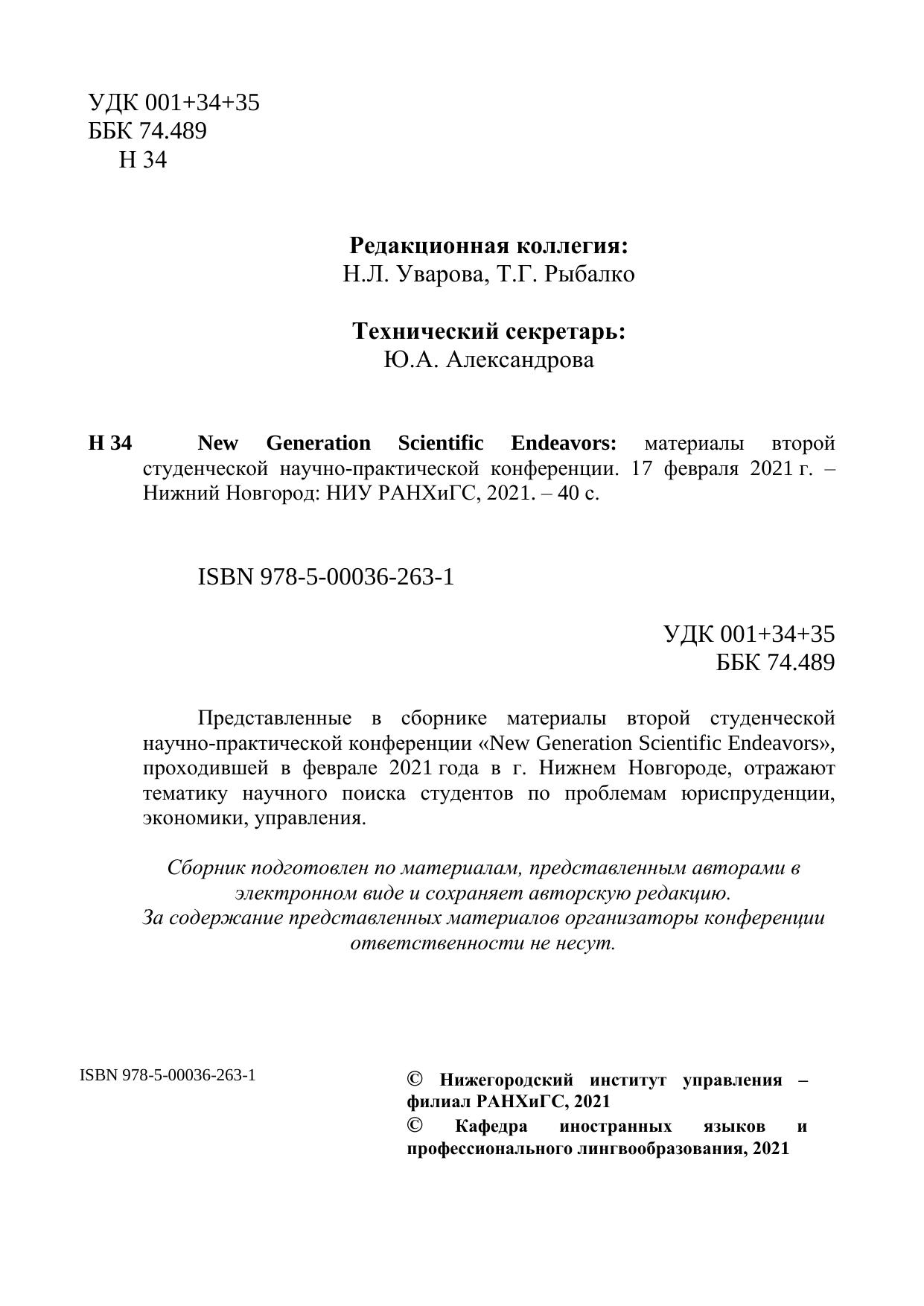 Представленные в сборнике материалы второй студенческой научно-практической конференции «New Generation Scientific Endeavors», проходившей в феврале 2021 года в г. Нижнем Новгороде, отражают тематику научного поиска студентов по проблемам юриспруденции, экономики, управления.