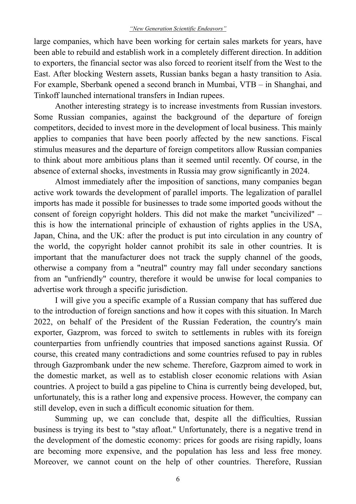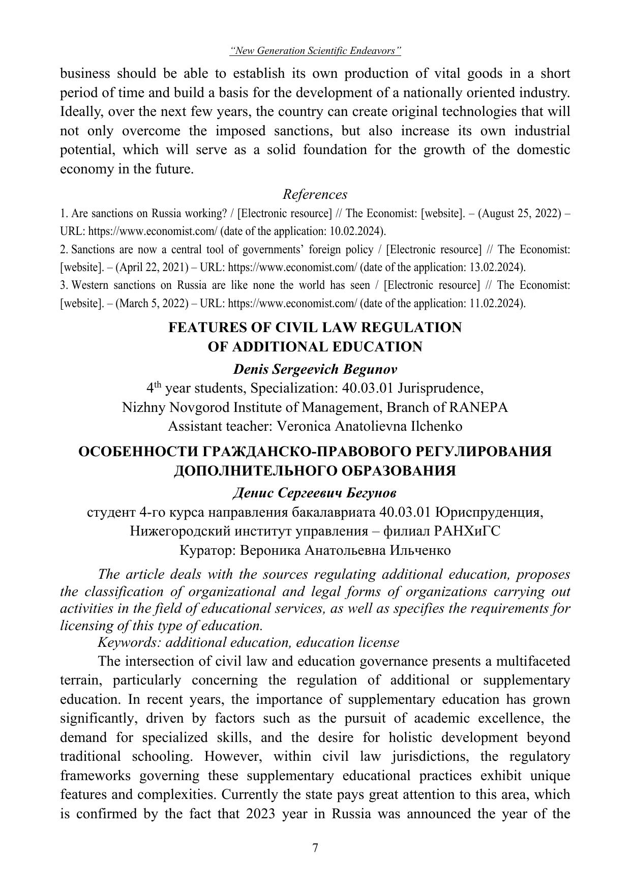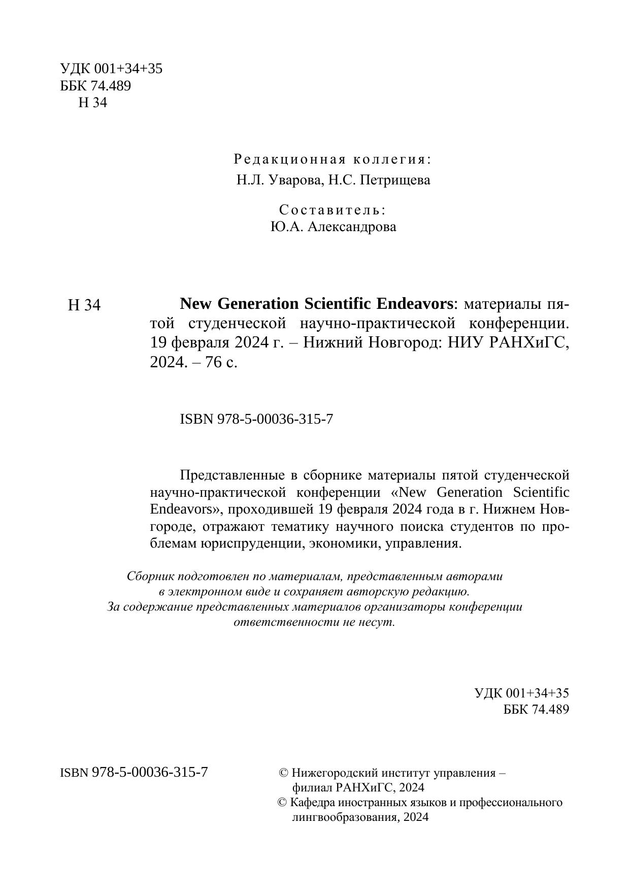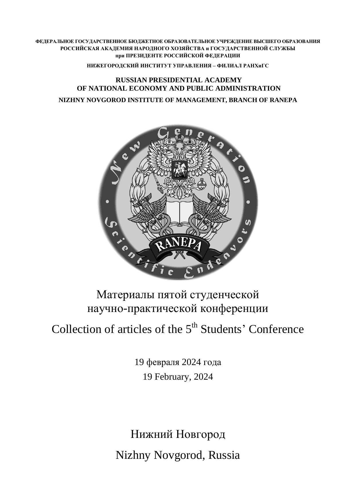 Представленные в сборнике материалы пятой студенческой научно-практической конференции «New Generation Scientific Endeavors», проходившей 19 февраля 2024 года в г. Нижнем Нов-городе, отражают тематику научного поиска студентов по про-блемам юриспруденции, экономики, управления.