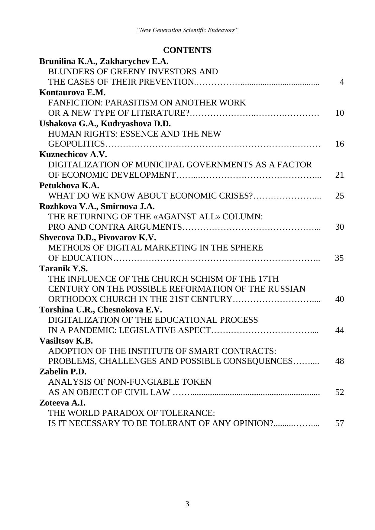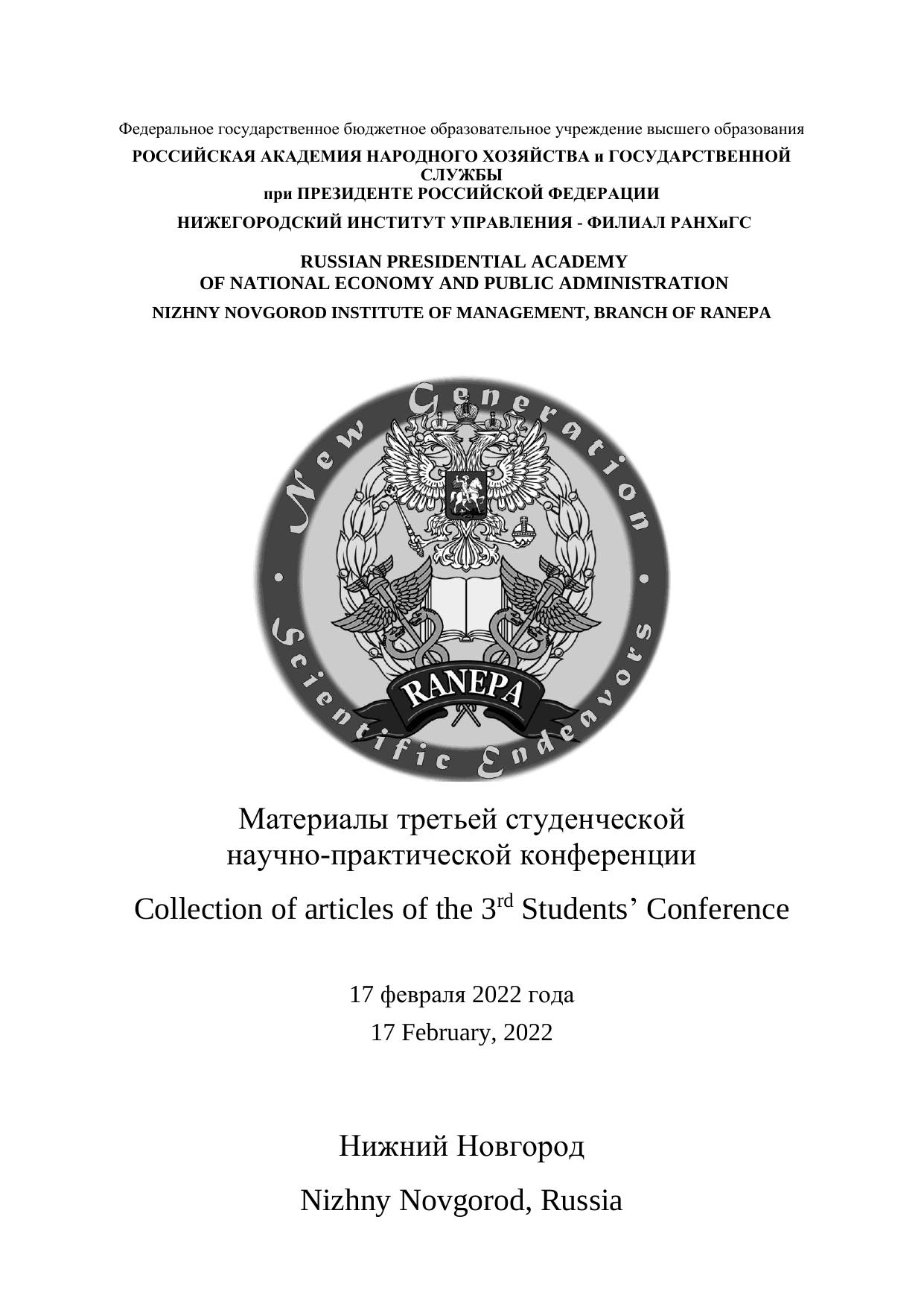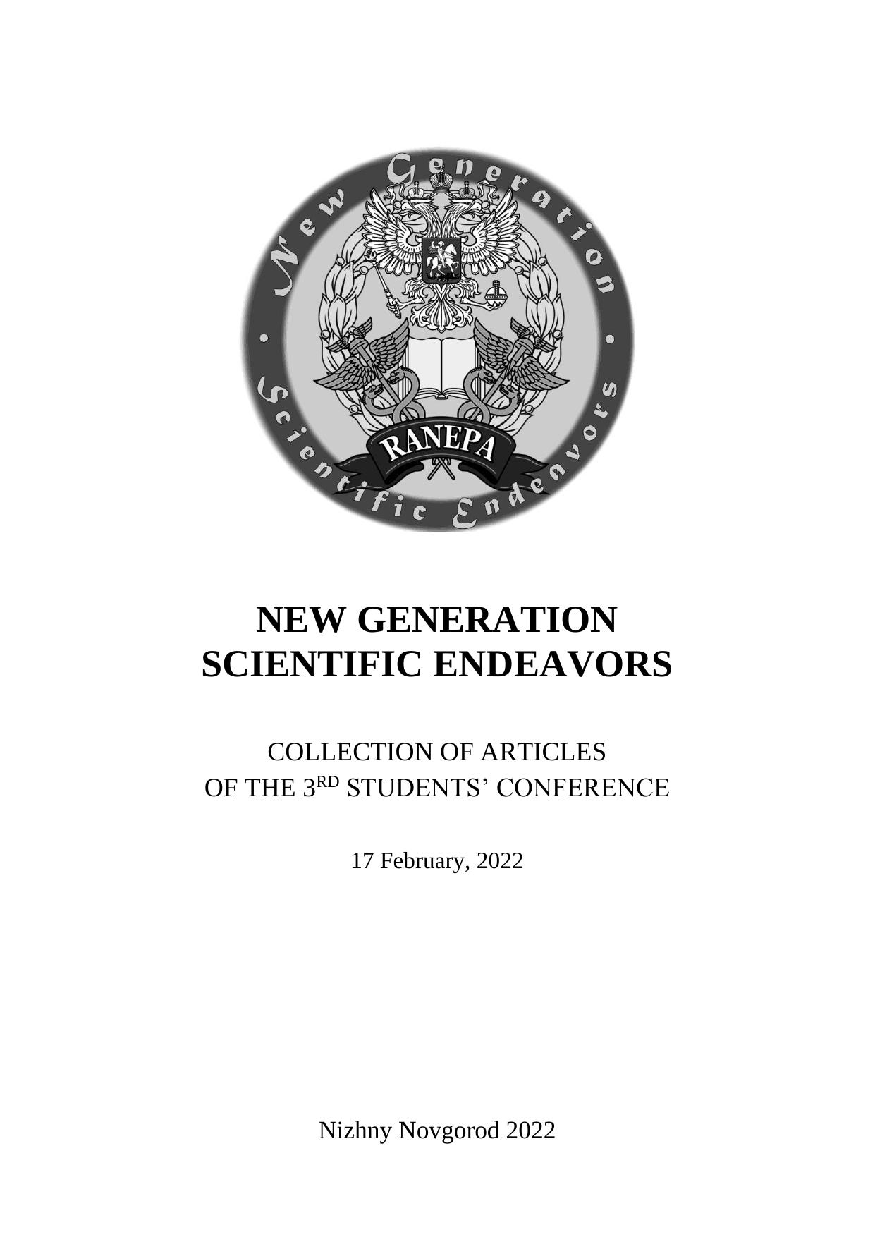Представленные в сборнике материалы третьей студенческой научно-практической конференции «New Generation Scientific Endeavors», проходившей в феврале 2022 года в г. Нижнем Новгороде, отражают тематику научного поиска студентов по проблемам юриспруденции, экономики, управления.