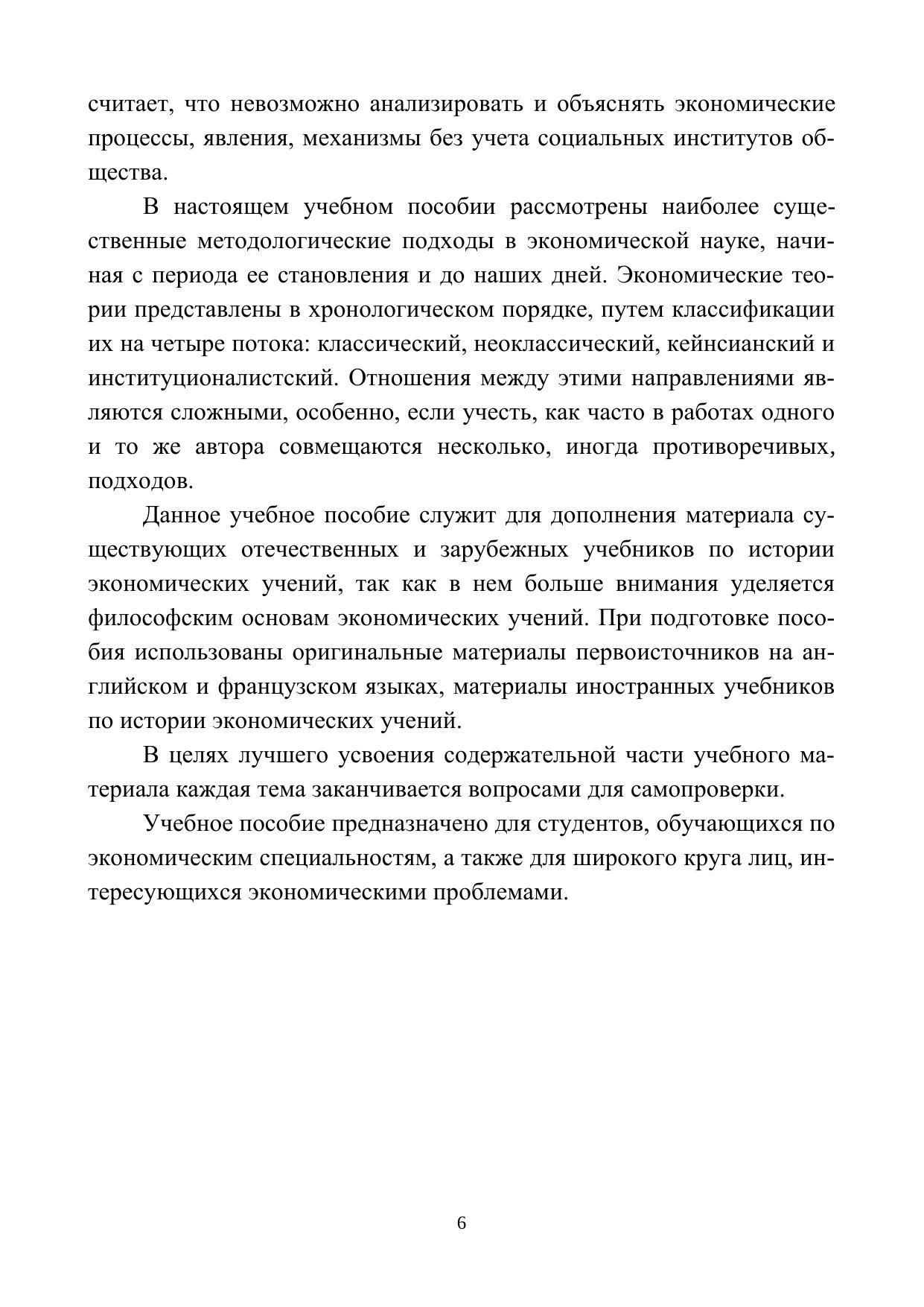 Учебное пособие разработано в соответствии с ФГОС по направлению подготовки 38.03.01 Экономика. В пособии рассмотрены наиболее существенные методологические подходы в экономической науке начиная с периода ее становления и до наших дней. Экономические теории представлены в хронологическом порядке, дана их классификация. Изучение концепций и теорий отдельных школ и направлений экономической мысли позволяет закрепить и углубить знания, полученные в курсе экономической теории. Учебное пособие предназначено для студентов, обучающихся по экономическим специальностям, а также для широкого круга лиц, интересующихся экономическими проблемами.