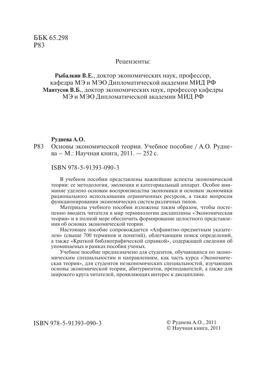 В учебном пособии представлены важнейшие аспекты экономической теории: ее методология, эволюция и категориальный аппарат. Особое внимание уделено основам воспроизводства экономики и основам экономики рационального использования ограниченных ресурсов, а также вопросам функционирования экономических систем различных типов. Материалы учебного пособия изложены таким образом, чтобы постепенно вводить читателя в мир терминологии дисциплины «Экономическая теория» и в полной мере обеспечить формирование целостного представления об основах экономической теории. Настоящее пособие сопровождается «Алфавитно-предметным указателем» (свыше 700 терминов и понятий), облегчающим поиск определений, а также «Краткой библиографической справкой», содержащей сведения об упоминаемых в рамках пособия ученых. Учебное пособие предназначено для студентов, обучающихся по экономическим специальностям и направлениям, как часть курса «Экономическая теория», для студентов неэкономических специальностей, изучающих основы экономической теории, абитуриентов, преподавателей, а также для широкого круга читателей, проявляющих интерес к дисциплине.