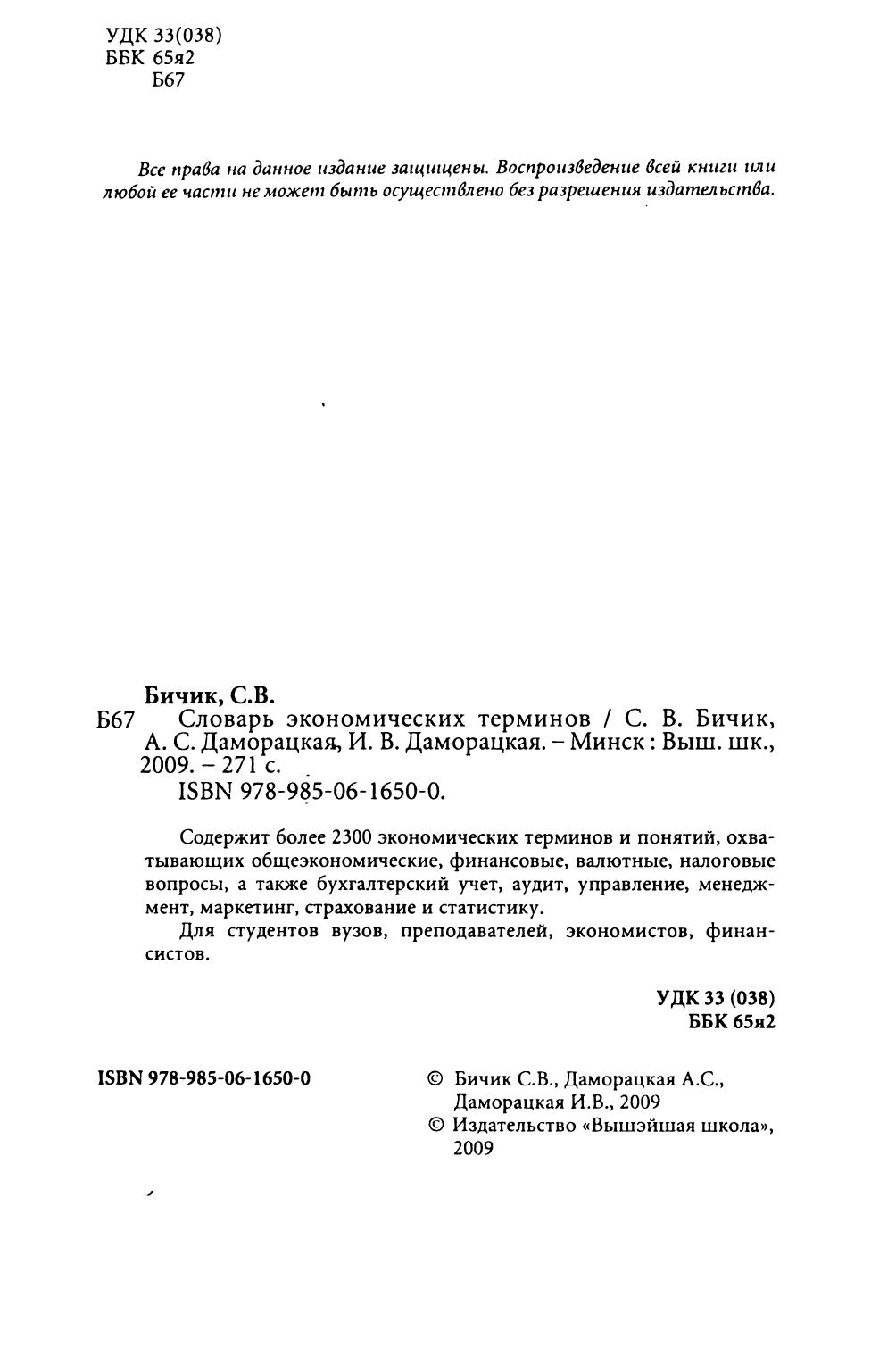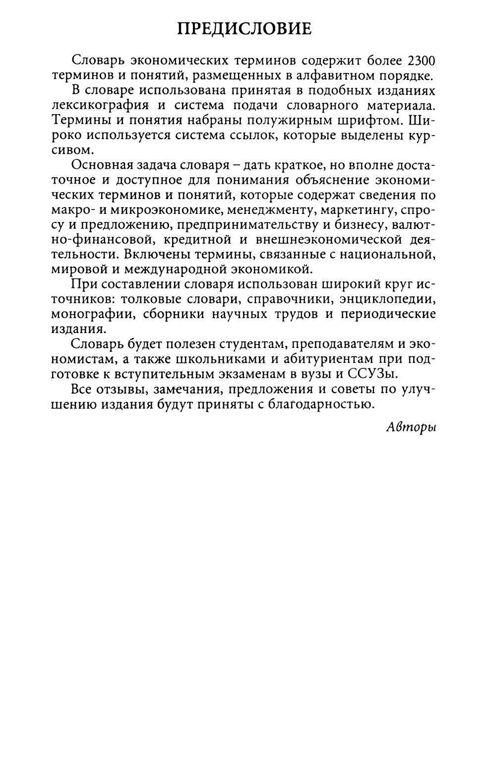 Содержит более 2300 экономических терминов и понятий, охватывающих общеэкономические, финансовые, валютные, налоговые вопросы, а также бухгалтерский учет, аудит, управление, менеджмент, маркетинг, страхование и статистику. Для студентов вузов, преподавателей, экономистов, финансистов.