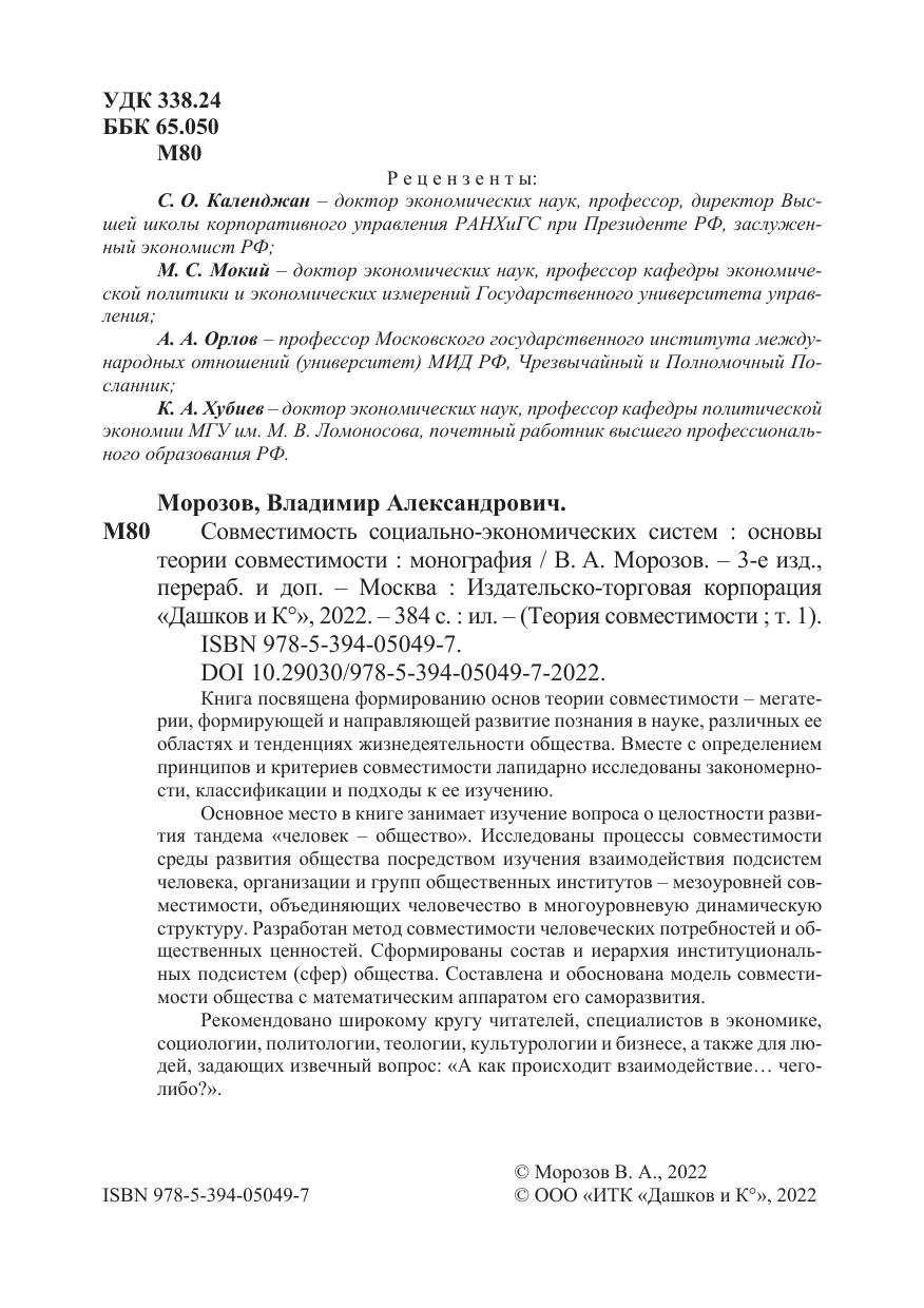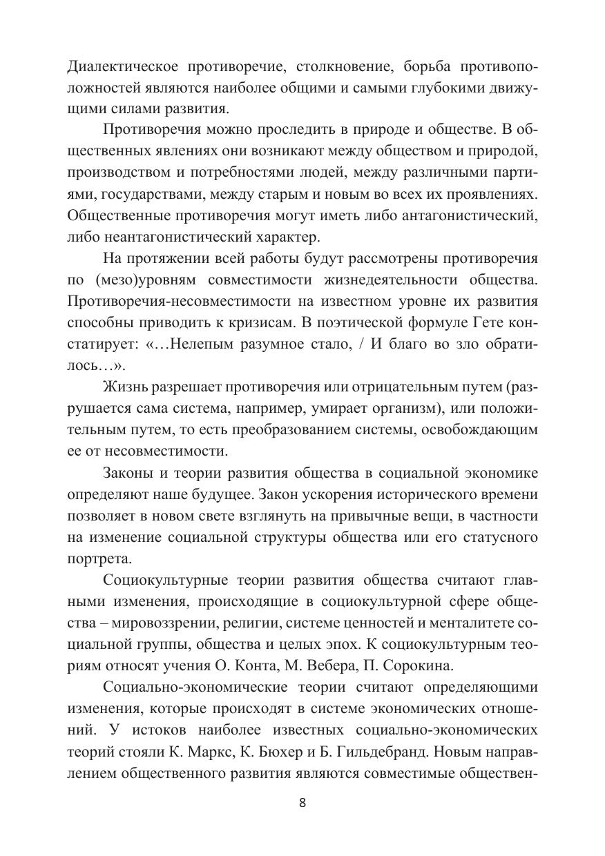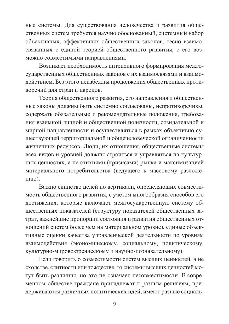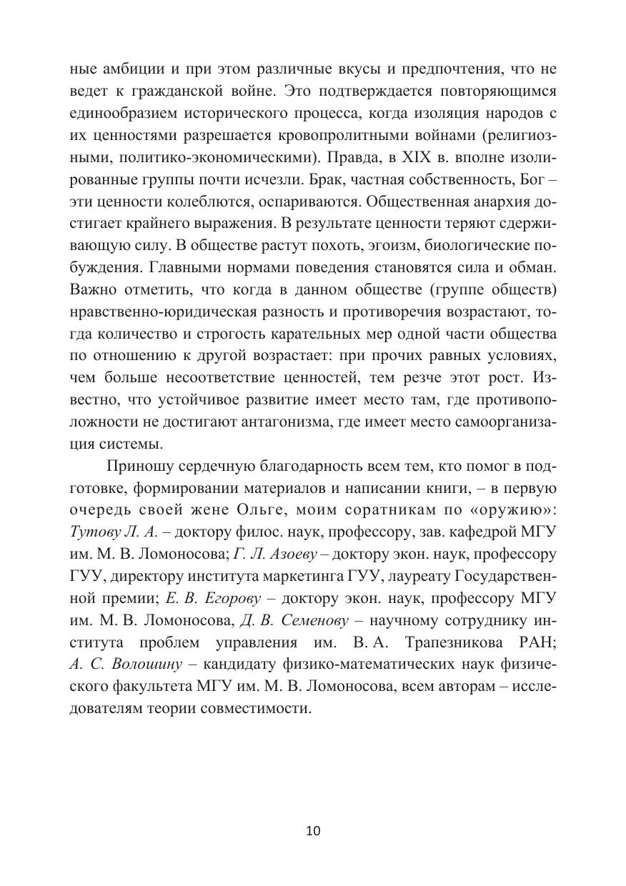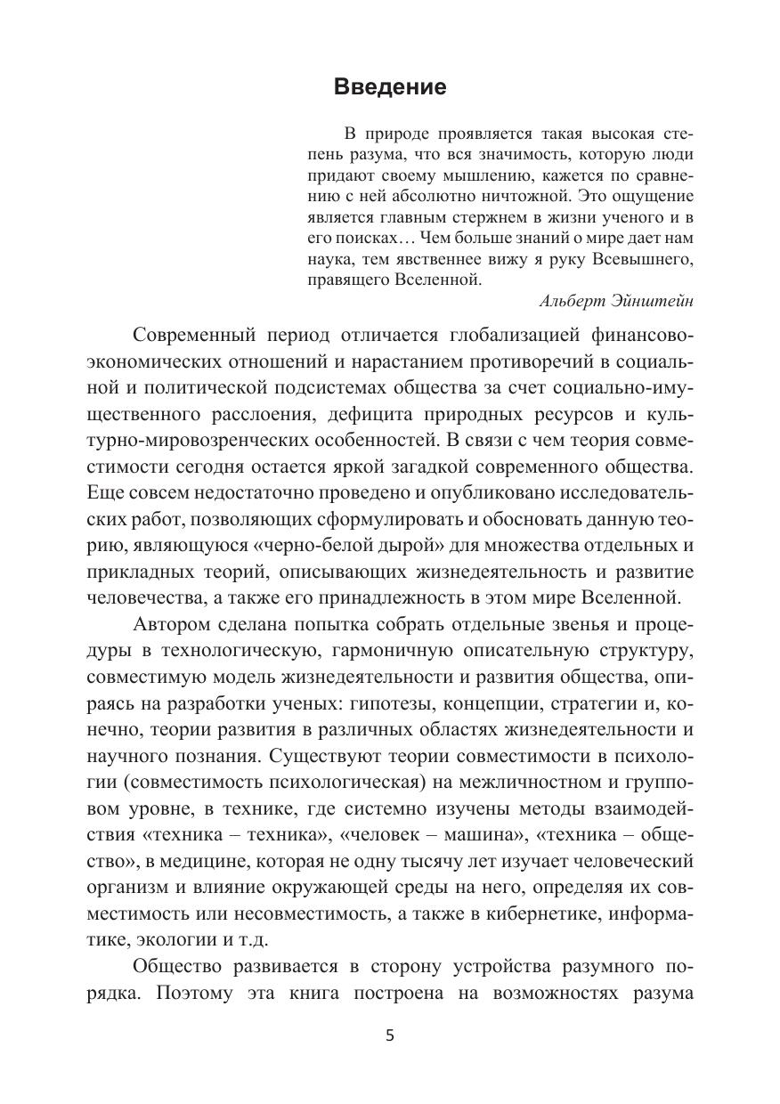 Основное место в книге занимает изучение вопроса о целостности развития тандема «человек – общество». Исследованы процессы совместимости среды развития общества посредством изучения взаимодействия подсистем человека, организации и групп общественных институтов – мезоуровней совместимости, объединяющих человечество в многоуровневую динамическую структуру. Разработан метод совместимости человеческих потребностей и общественных ценностей. Сформированы состав и иерархия институциональных подсистем (сфер) общества. Составлена и обоснована модель совместимости общества с математическим аппаратом его саморазвития.