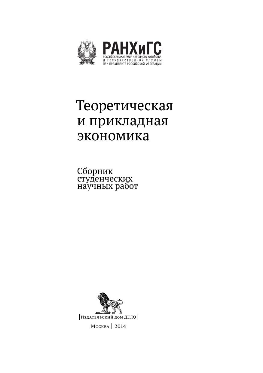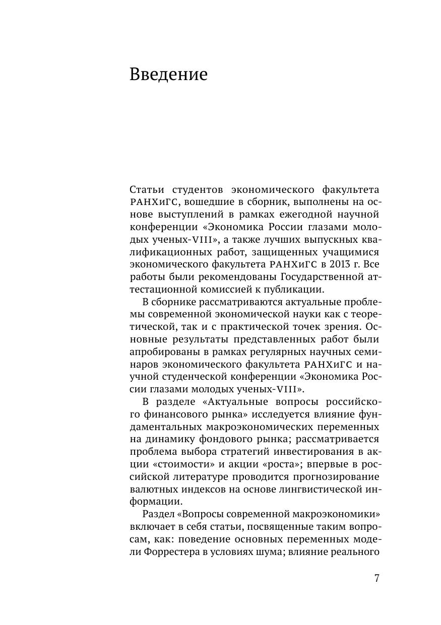 В сборнике опубликованы статьи студентов бакалавриата и магистратуры РАНХ и ГС при Президенте Российской Федерации, выполненные на основе выступлений в рамках ежегодной научной конференции «Экономика России глазами молодых ученых– VIII », а также лучших выпускных квалификационных работ, защищенных учащимися экономического факультета РАНХ и ГС в 2013 г.