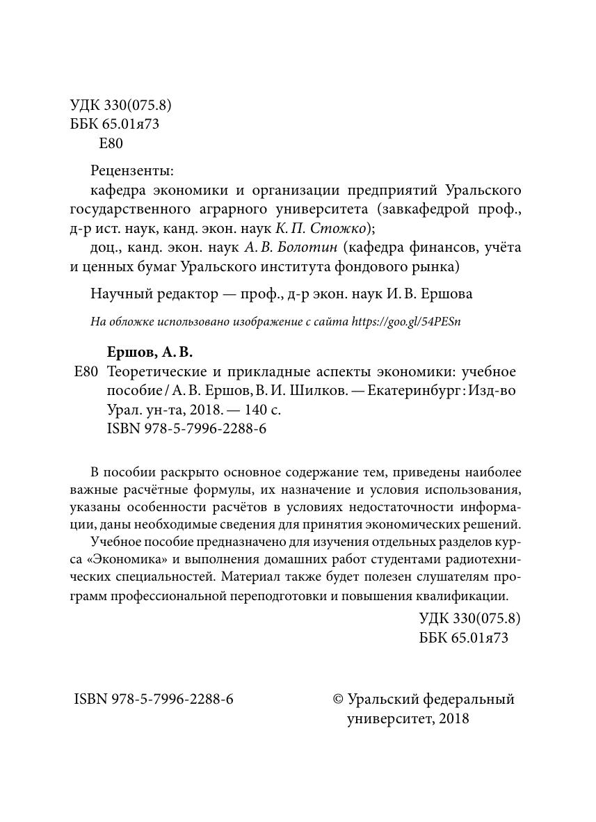 В пособии раскрыто основное содержание тем, приведены наиболее важные расчётные формулы, их назначение и условия использования, указаны особенности расчётов в условиях недостаточности информации, даны необходимые сведения для принятия экономических решений. Учебное пособие предназначено для изучения отдельных разделов курса «Экономика» и выполнения домашних работ студентами радиотехнических специальностей. Материал также будет полезен слушателям программ профессиональной переподготовки и повышения квалификации.