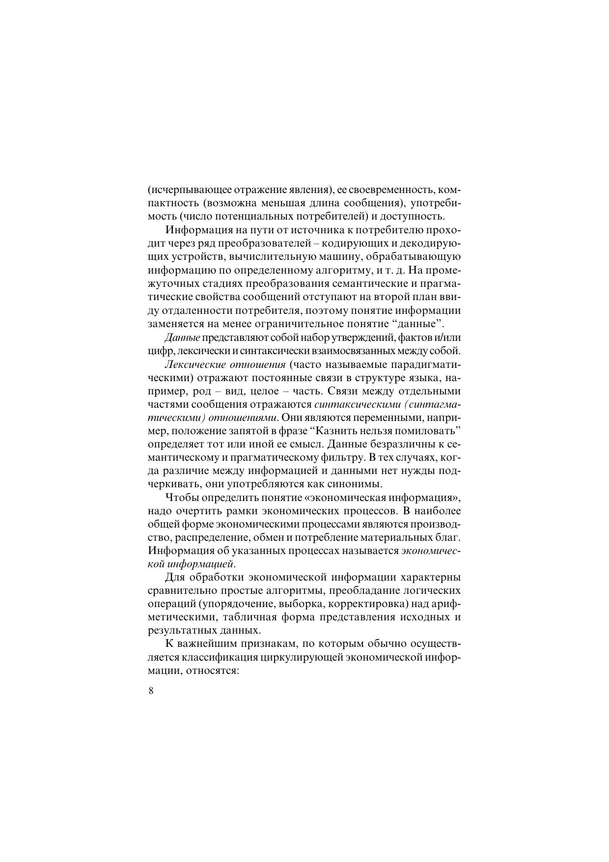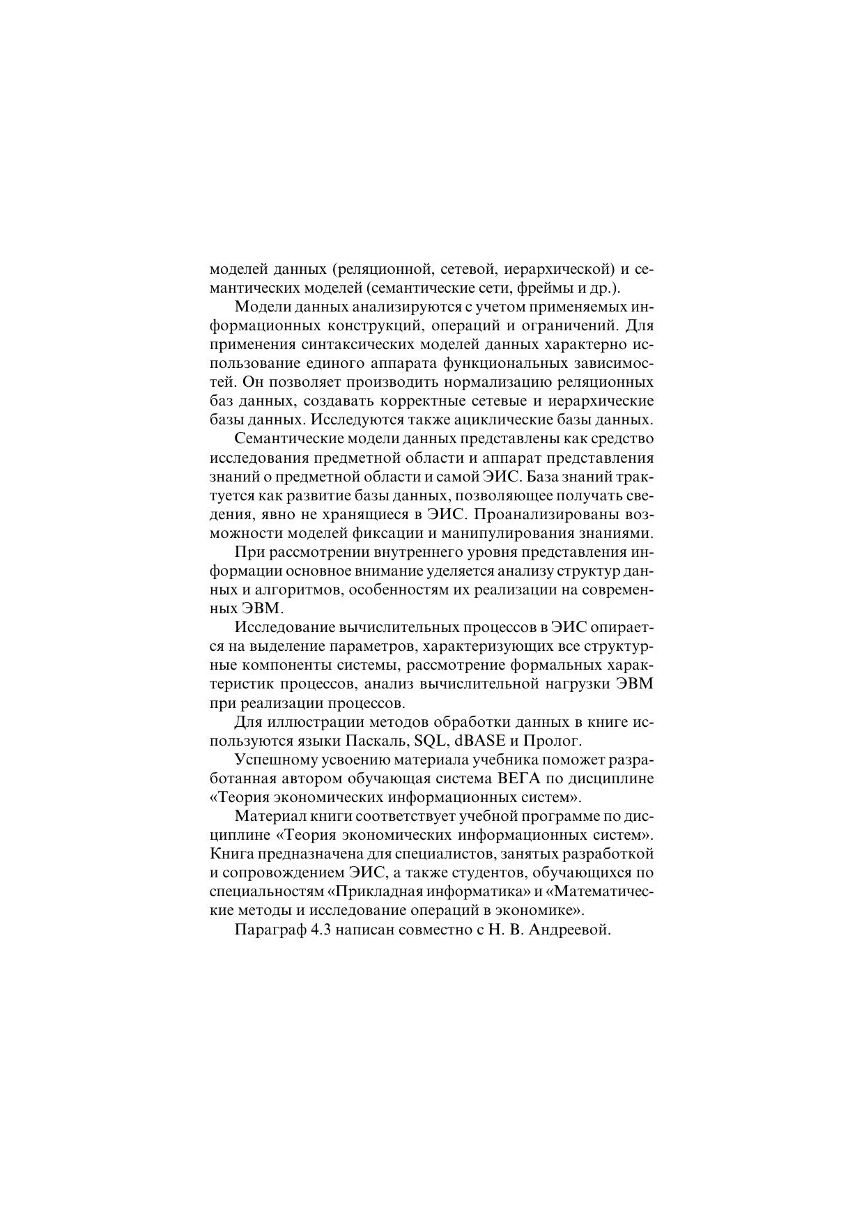 Дается характеристика компонентов экономических информационных систем (ЭИС) - вычислительной системы, базы данных, программного обеспечения; рассматриваются этапы их жизненного цикла - проектирование, внедрение, эксплуатация, развитие. Моделирование представлений информации в ЭИС предполагает использование синтаксических моделей данных (реляционной, сетевой и иерархической) и семантических моделей (семантические сети, фреймы и др.). Моделирование процессов опирается на сети Петри. Т еоретические методы проектирования иллюстрируются практическими задачами. Для иллюстрации методов обработки данных используются языки Паскаль, SQL, dBASE и Пролог.