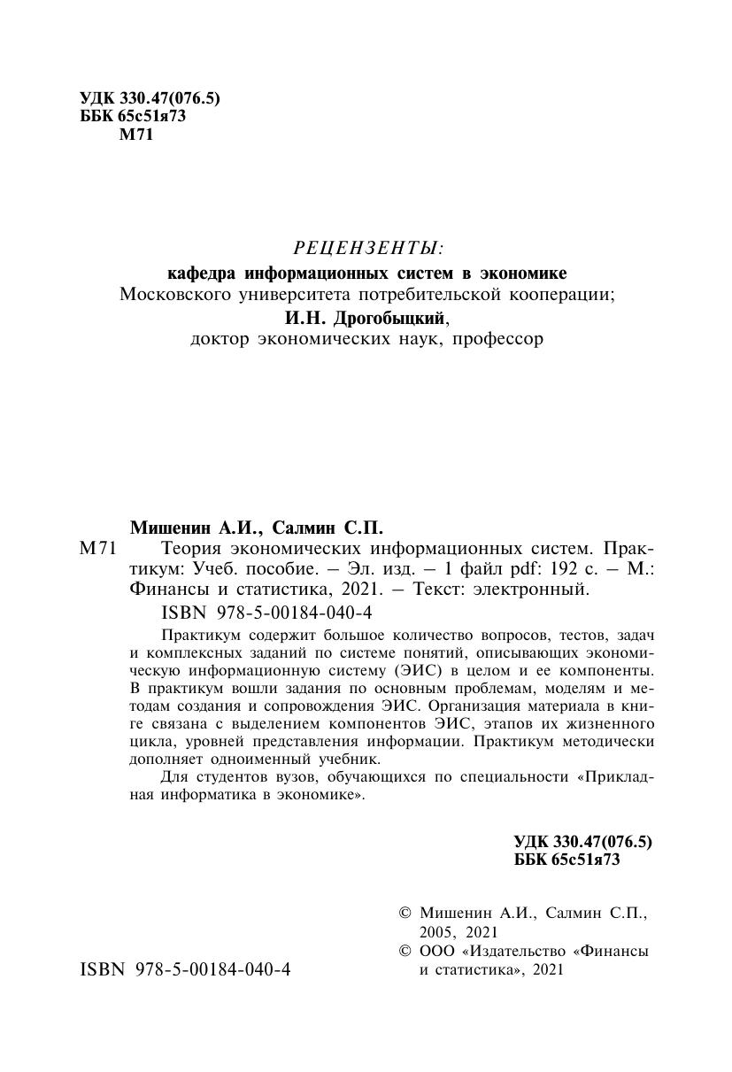 Практикум содержит большое количество вопросов, тестов, задач и комплексных заданий по системе понятий, описывающих экономическую информационную систему (ЭИС) в целом и ее компоненты. В практикум вошли задания по основным проблемам, моделям и методам создания и сопровождения ЭИС. Организация материала в книге связана с выделением компонентов ЭИС, этапов их жизненного цикла, уровней представления информации. Практикум методически дополняет одноименный учебник.