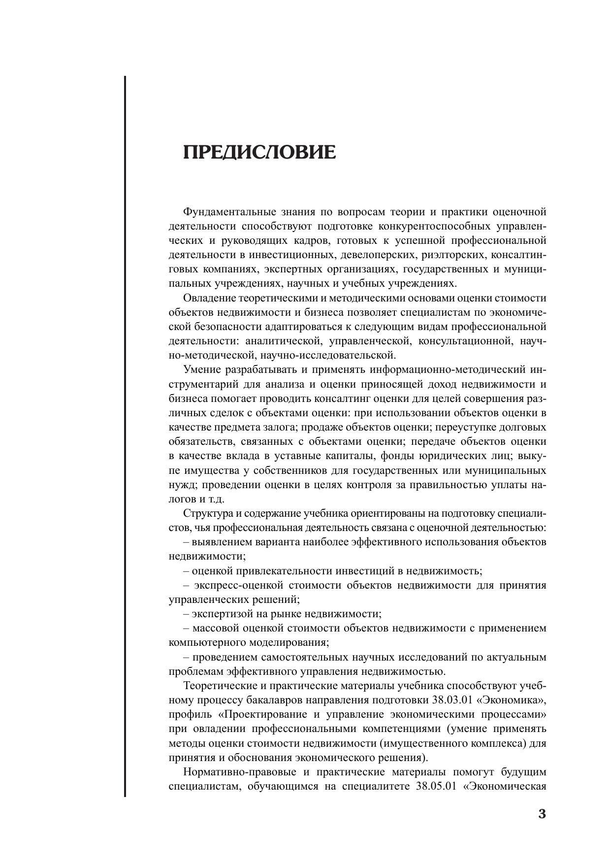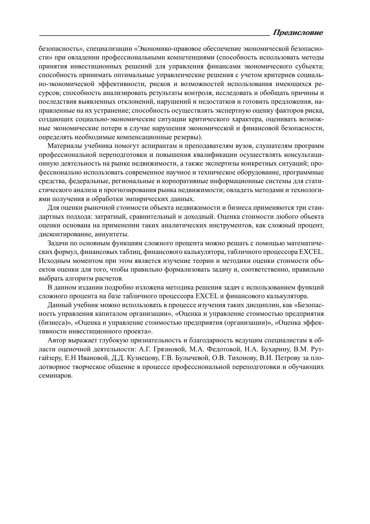 В учебнике освещаются вопросы регулирования оценочной деятельности в Российской Федерации в свете нового законодательства. Раскрываются методологические основы оценки стоимости недвижимого имущества, излагается методика практических расчетов стоимости объектов оценки, предлагается алгоритм применения инструментария анализа и оценки недвижимости. Оценка недвижимости и бизнеса основана на применении основных функций сложного процента и трех методических подходов – затратного, сравнительного, доходного. Методика их использования раскрывается в процессе решения типовых задач по оценке стоимости объектов недвижимости и бизнеса с использованием математических формул, финансовых таблиц, финансового калькулятора, а также на базе табличного процессора EXCEL. Для студентов, обучающихся по направлению подготовки 38.03.01 «Экономика» и специалитету 38.05.01 «Экономическая безопасность», аспирантов и преподавателей вузов, слушателей программ профессиональной переподготовки и повышения квалификации, а также практикующих специалистов в области оценочной деятельности.