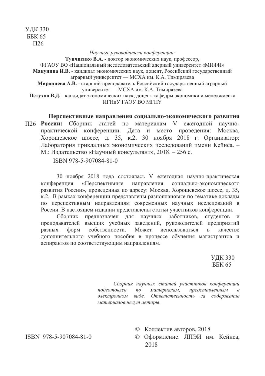 30 ноября 2018 года состоялась V ежегодная научно-практическая конференция «Перспективные направления социально-экономического развития России», проведенная по адресу: Москва, Хорошевское шоссе, д. 35 к.2. В рамках конференции представлены разноплановые по тематике доклады по перспективным направлениям современных научных исследований в России. В настоящем издании представлены статьи участников конференции.