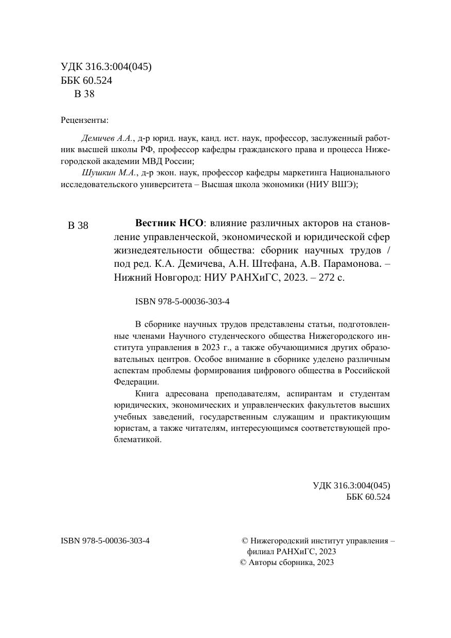 В сборнике научных трудов представлены статьи, подготовленные членами Научного студенческого общества Нижегородского института управления в 2023 г., а также обучающимися других образовательных центров. Особое внимание в сборнике уделено различным аспектам проблемы формирования цифрового общества в Российской Федерации. Книга адресована преподавателям, аспирантам и студентам юридических, экономических и управленческих факультетов высших учебных заведений, государственным служащим и практикующим юристам, а также читателям, интересующимся соответствующей проблематикой.