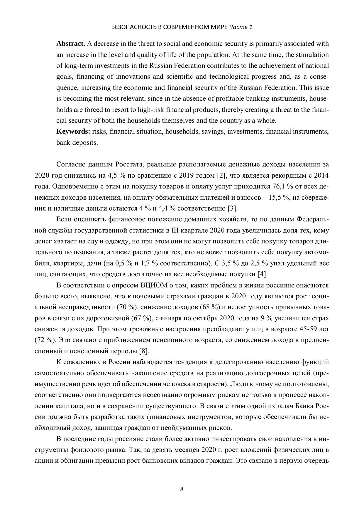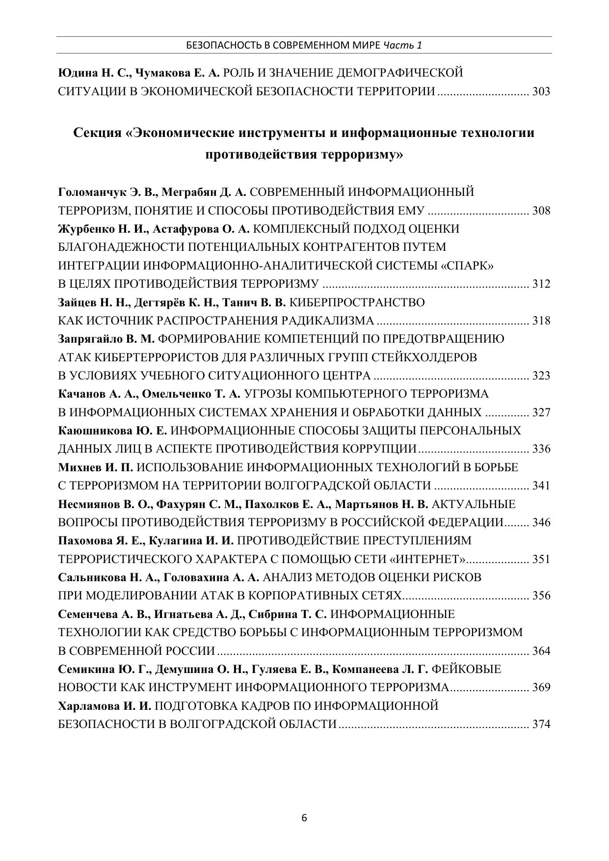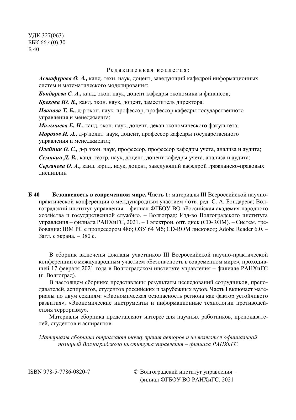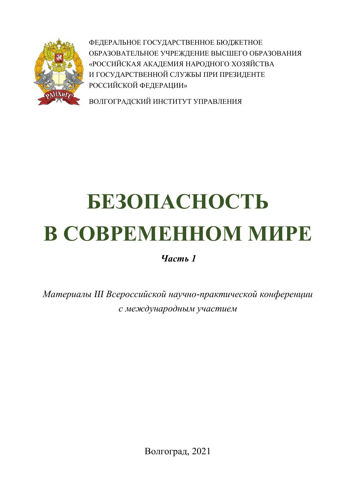 В сборник включены доклады участников III Всероссийской научно-практической конференции с международным участием «Безопасность в современном мире», проходившей 17 февраля 2021 года в Волгоградском институте управления – филиале РАНХиГС (г. Волгоград). В настоящем сборнике представлены результаты исследований сотрудников, преподавателей, аспирантов, студентов российских и зарубежных вузов. Часть I включает материалы по двум секциям: «Экономическая безопасность региона как фактор устойчивого развития», «Экономические инструменты и информационные технологии противодействия терроризму». Материалы сборника представляют интерес для научных работников, преподавателей, студентов и аспирантов.