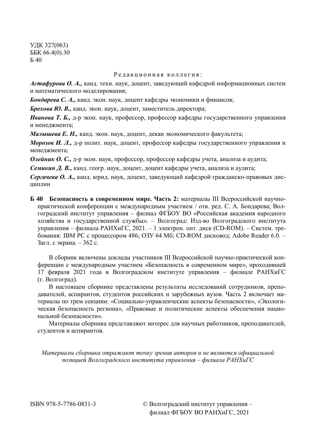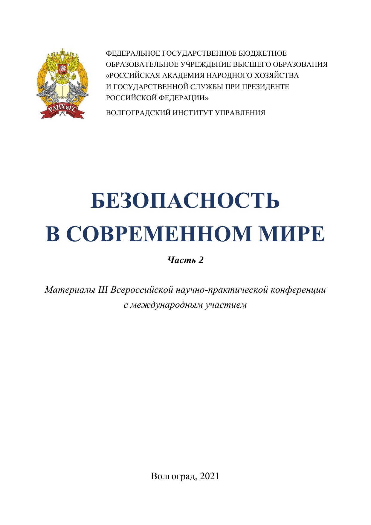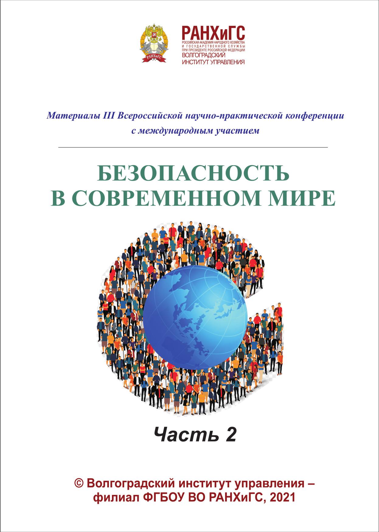 В сборник включены доклады участников III Всероссийской научно-практической конференции с международным участием «Безопасность в современном мире», проходившей 17 февраля 2021 года в Волгоградском институте управления – филиале РАНХиГС (г. Волгоград). В настоящем сборнике представлены результаты исследований сотрудников, преподавателей, аспирантов, студентов российских и зарубежных вузов. Часть 2 включает материалы по трем секциям: «Социально-управленческие аспекты безопасности», «Экологическая безопасность региона», «Правовые и политические аспекты обеспечения национальной безопасности». Материалы сборника представляют интерес для научных работников, преподавателей, студентов и аспирантов.