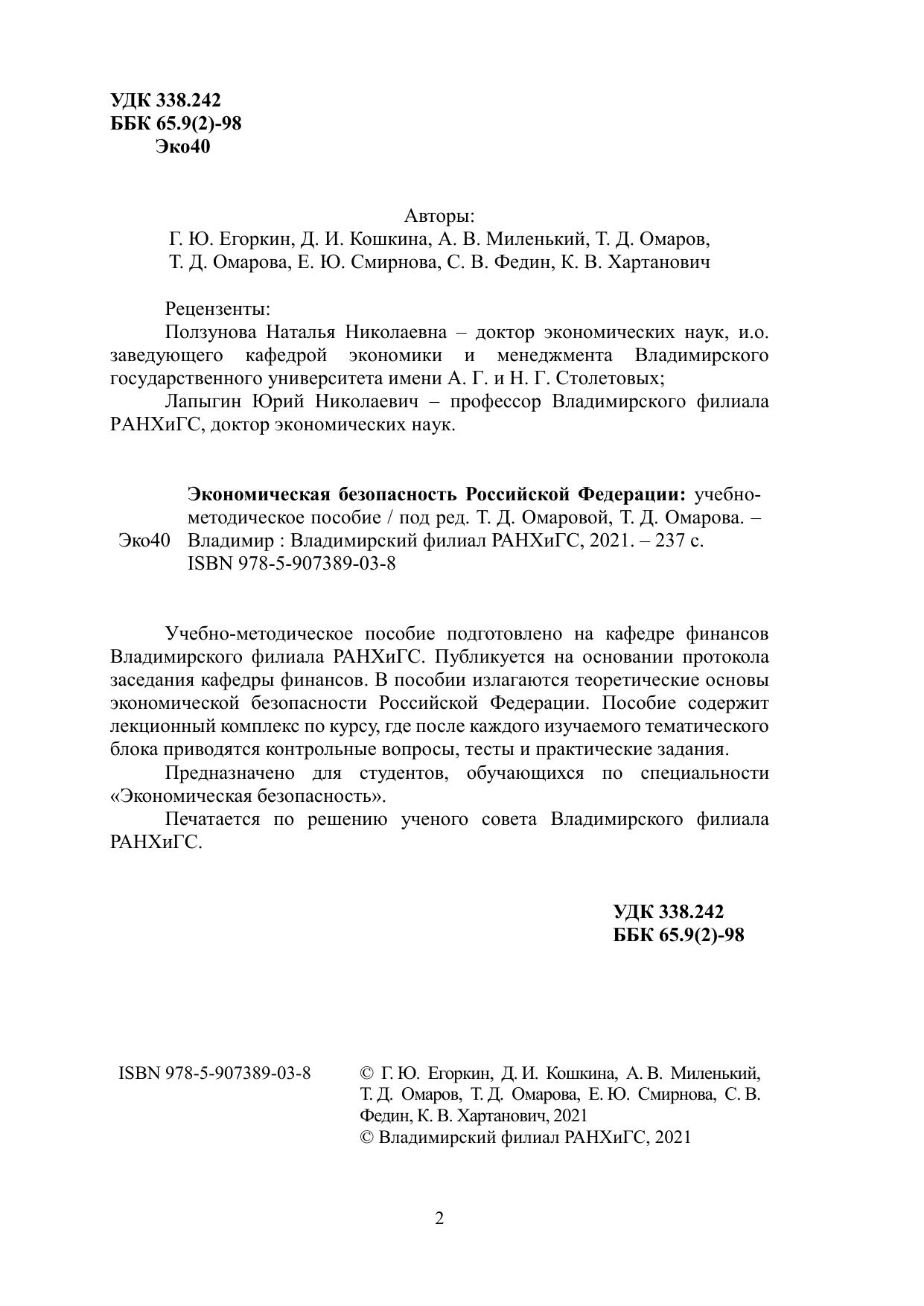 Учебно-методическое пособие подготовлено на кафедре финансов Владимирского филиала РАНХиГС. Публикуется на основании протокола заседания кафедры финансов. В пособии излагаются теоретические основы экономической безопасности Российской Федерации. Пособие содержит лекционный комплекс по курсу, где после каждого изучаемого тематического блока приводятся контрольные вопросы, тесты и практические задания. Предназначено для студентов, обучающихся по специальности «Экономическая безопасность». Печатается по решению ученого совета Владимирского филиала РАНХиГС.
