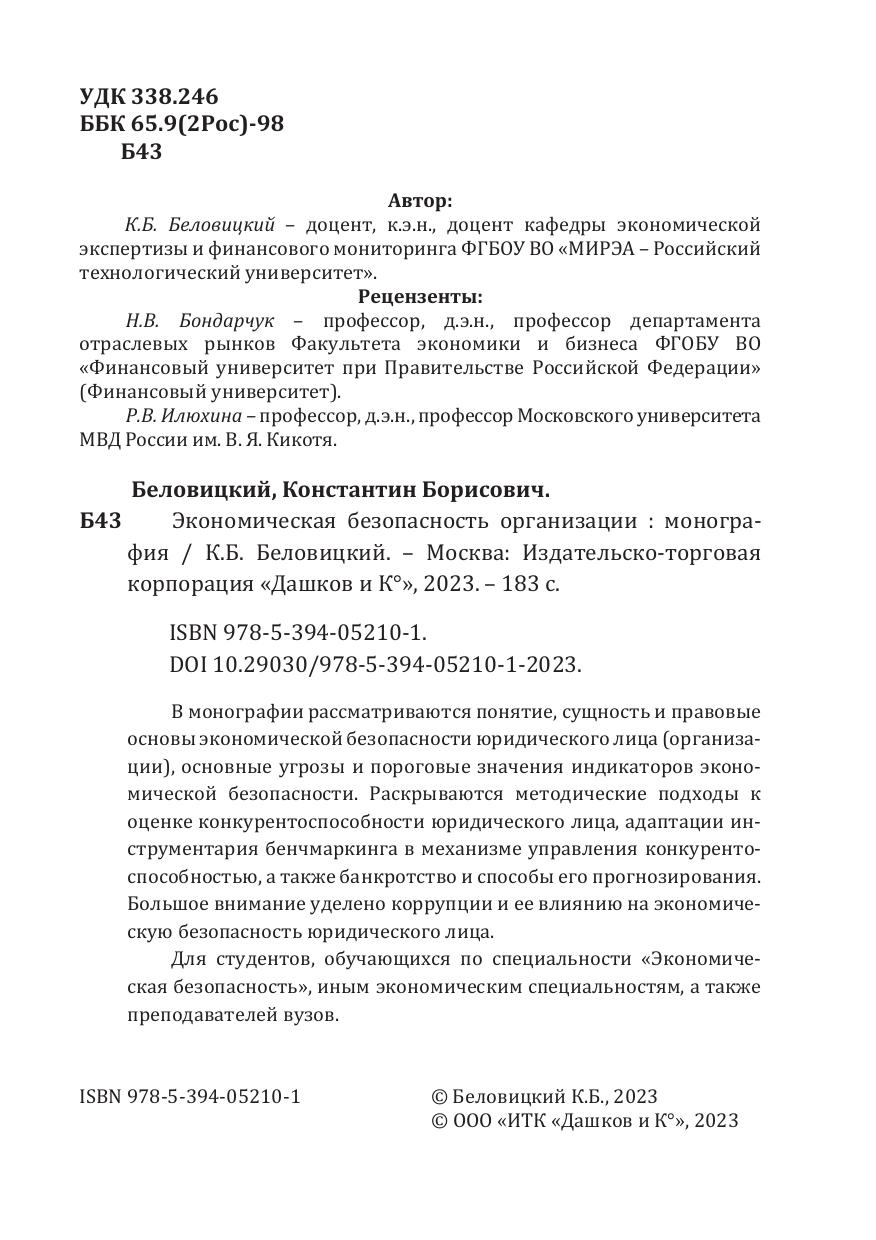 В монографии рассматриваются понятие, сущность и правовые основы экономической безопасности юридического лица (организации), основные угрозы и пороговые значения индикаторов экономической безопасности. Раскрываются методические подходы к оценке конкурентоспособности юридического лица, адаптации инструментария бенчмаркинга в механизме управления конкурентоспособностью, а также банкротство и способы его прогнозирования. Большое внимание уделено коррупции и ее влиянию на экономическую безопасность юридического лица.