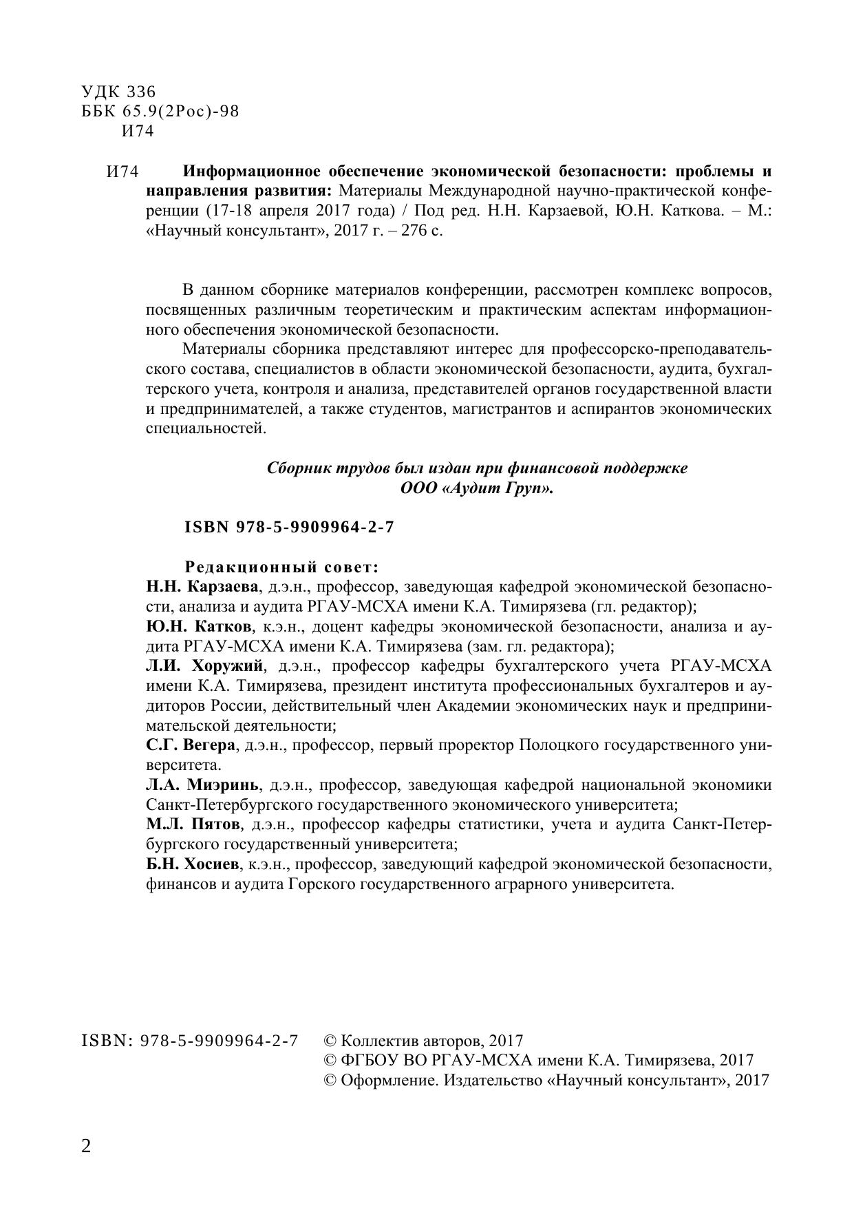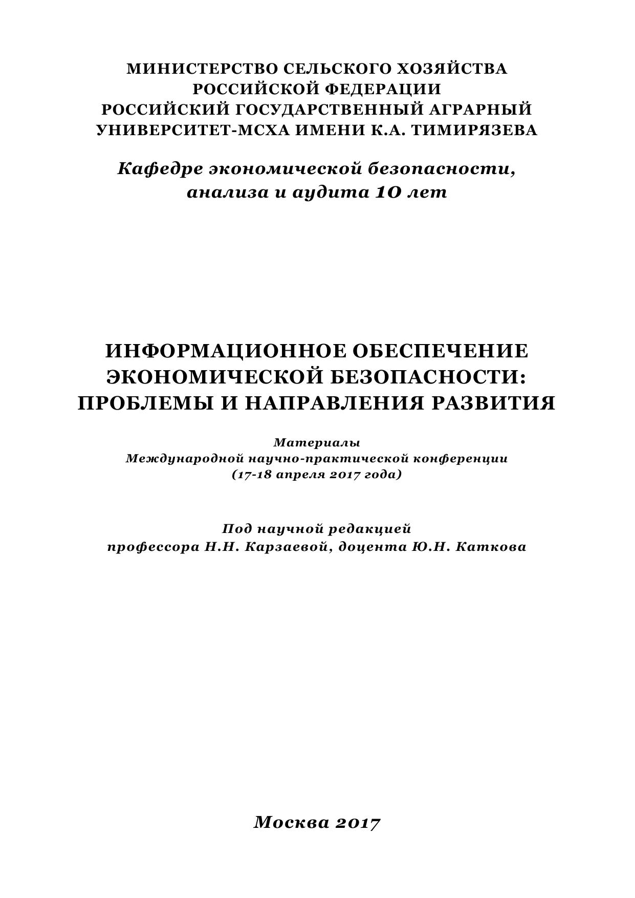 В данном сборнике материалов конференции, рассмотрен комплекс вопросов, посвященных различным теоретическим и практическим аспектам информационного обеспечения экономической безопасности. Материалы сборника представляют интерес для профессорско-преподавательского состава, специалистов в области экономической безопасности, аудита, бухгалтерского учета, контроля и анализа, представителей органов государственной власти и предпринимателей, а также студентов, магистрантов и аспирантов экономических специальностей.