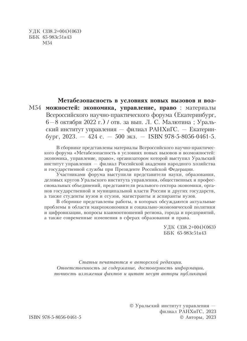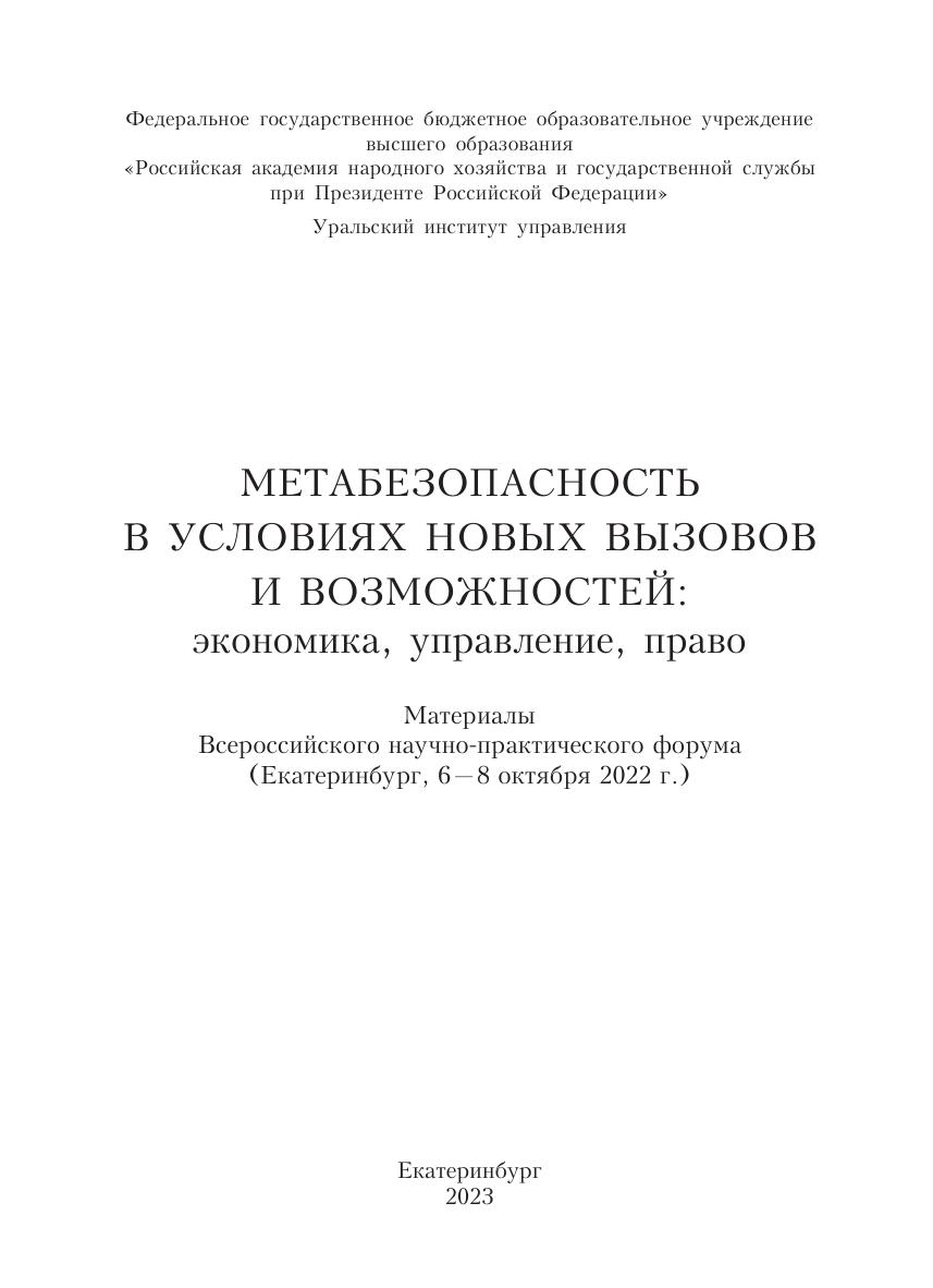 Метабезопасность в условиях новых вызовов и возможностей: экономика, управление, право: материалы Всероссийского научно-практического форума (Екатеринбург 6-8 октября 2022 г.)