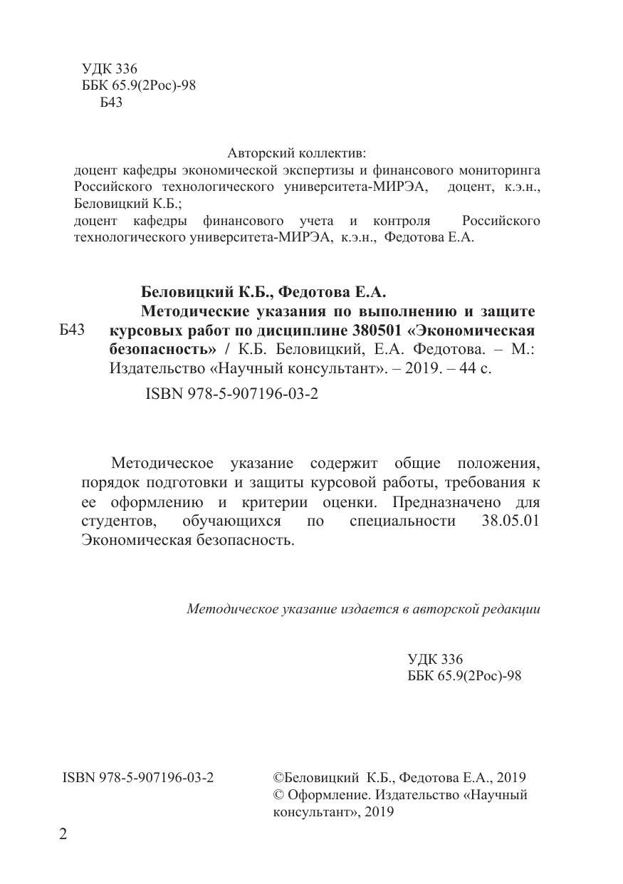Методическое указание содержит общие положения, порядок подготовки и защиты курсовой работы, требования к ее оформлению и критерии оценки. Предназначено для студентов, обучающихся по специальности 38.05.01 Экономическая безопасность.