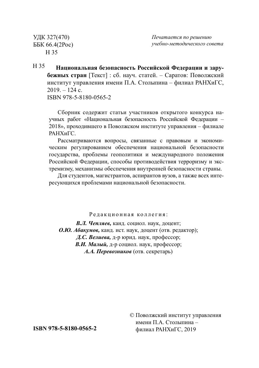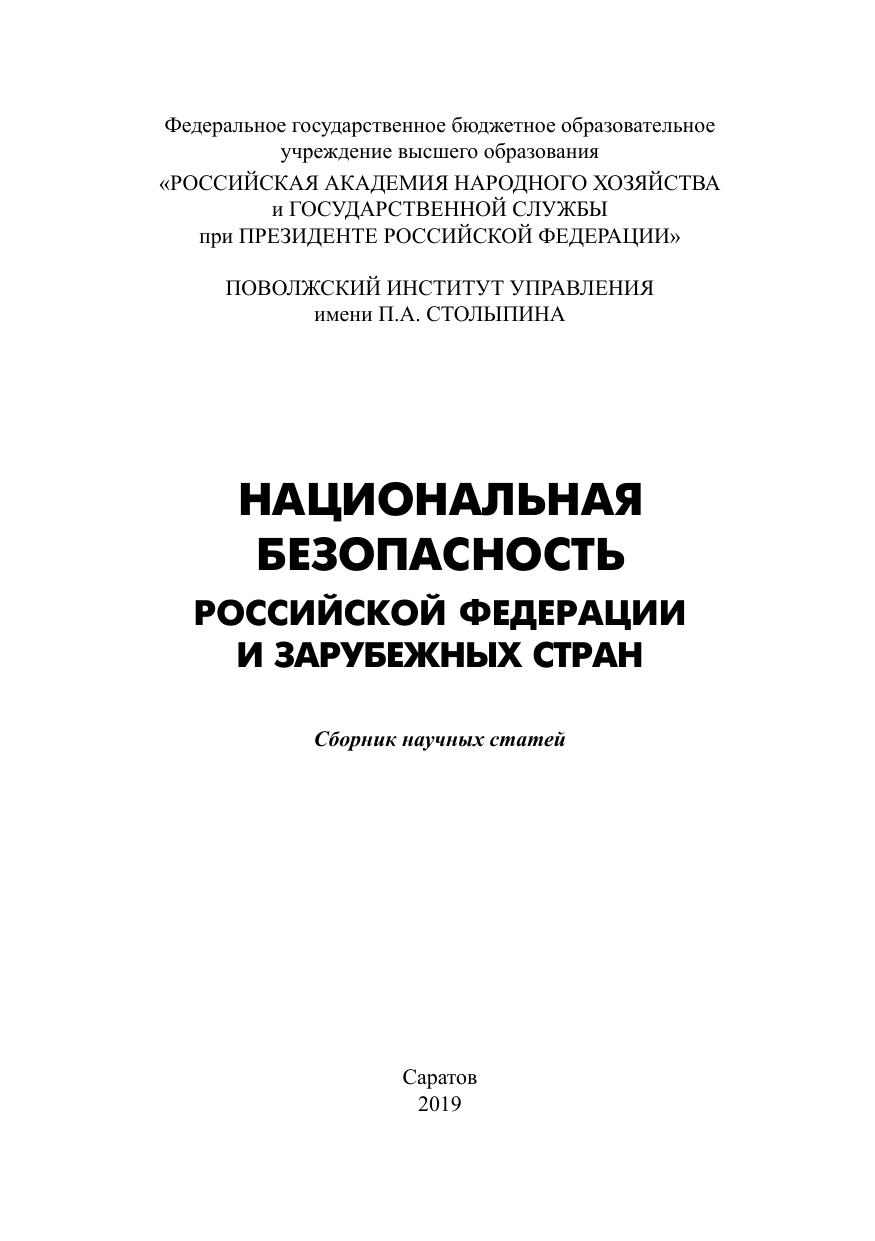 Сборник содержит статьи участников открытого конкурса научных работ «Национальная безопасность Российской Федерации – 2018», проходившего в Поволжском институте управления – филиале РАНХиГС. Рассматриваются вопросы, связанные с правовым и экономическим регулированием обеспечения национальной безопасности государства, проблемы геополитики и международного положения Российской Федерации, способы противодействия терроризму и экстремизму, механизмы обеспечения внутренней безопасности страны. Для студентов, магистрантов, аспирантов вузов, а также всех интересующихся проблемами национальной безопасности.