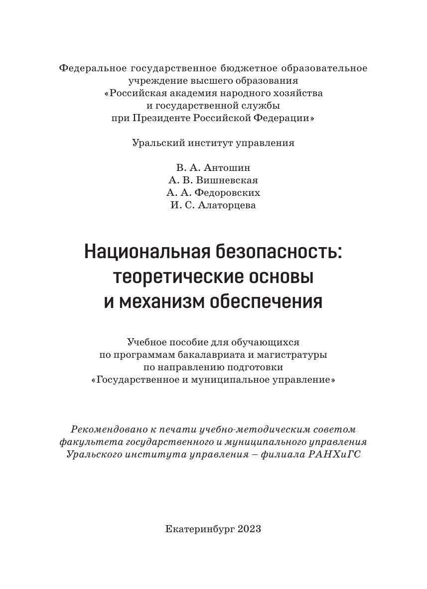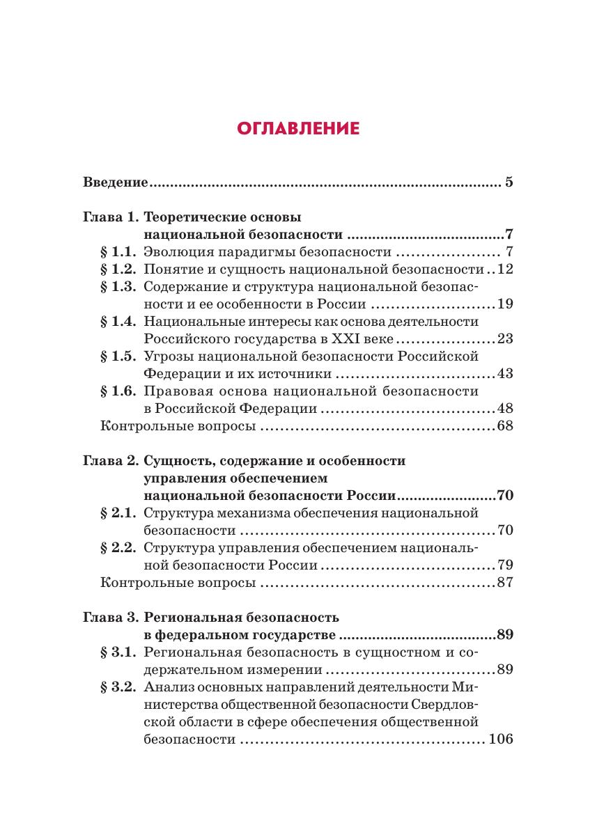 Целями предлагаемого учебного пособия является формирование необходимого объема знаний в области теории национальной безопасности, ознакомление с понятийным аппаратом и терминологией в сфере обеспечения национальной безопасности; расширение представлений у обучающихся о механизме обеспечения национальной безопасности Российской Федерации с учетом регионального опыта. Пособие адресовано студентам высших учебных заведений, обучающихся по программе бакалавриата и магистратуры по направлению подготовки «Государственное и муниципальное управление», а также всем тем, кто интересуется проблемами национальной безопасности.