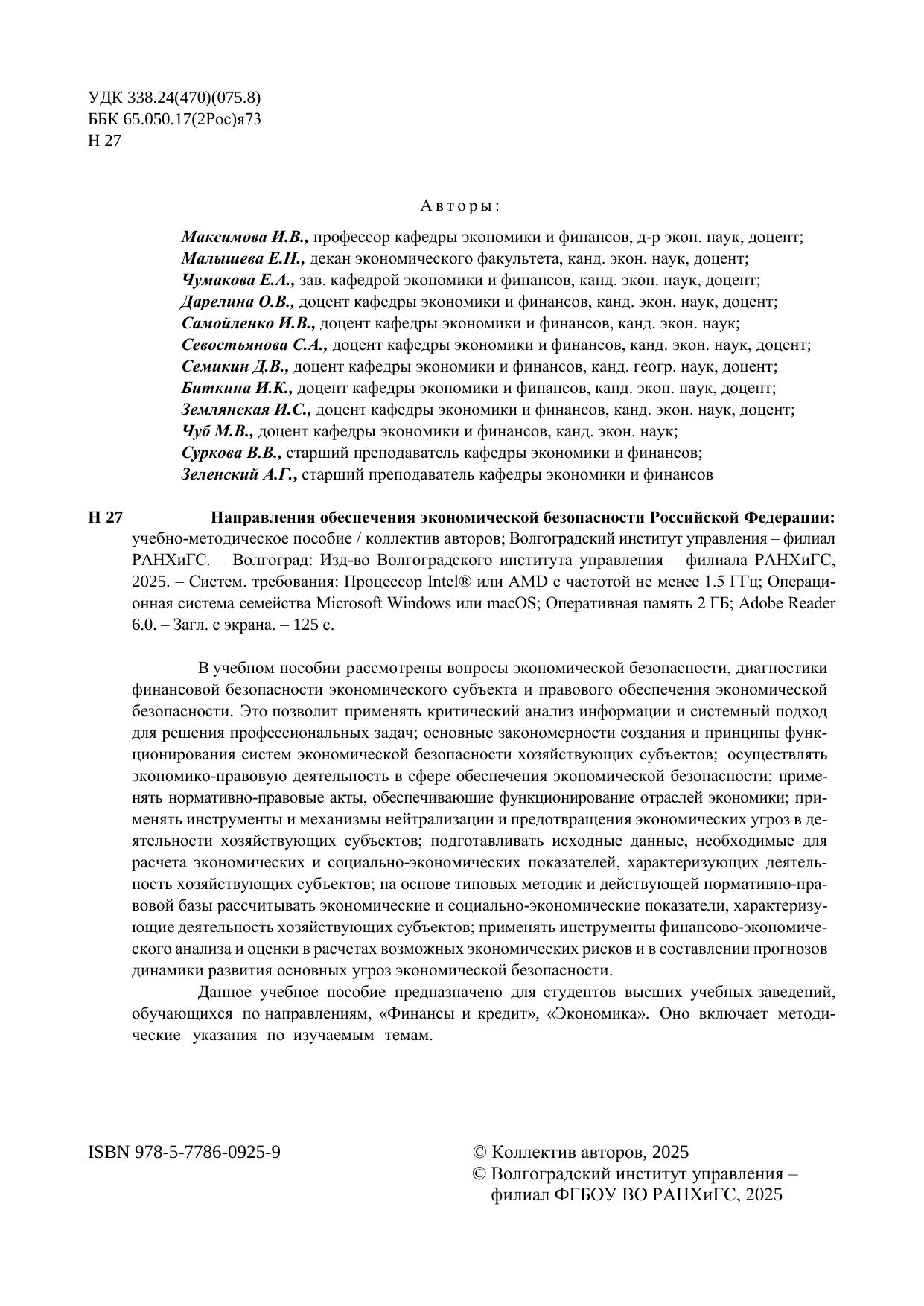 В учебном пособии рассмотрены вопросы экономической безопасности, диагностики финансовой безопасности экономического субъекта и правового обеспечения экономической безопасности. Это позволит применять критический анализ информации и системный подход для решения профессиональных задач; основные закономерности создания и принципы функционирования систем экономической безопасности хозяйствующих субъектов; осуществлять экономико-правовую деятельность в сфере обеспечения экономической безопасности; применять нормативно-правовые акты, обеспечивающие функционирование отраслей экономики; применять инструменты и механизмы нейтрализации и предотвращения экономических угроз в деятельности хозяйствующих субъектов; подготавливать исходные данные, необходимые для расчета экономических и социально-экономических показателей, характеризующих деятельность хозяйствующих субъектов; на основе типовых методик и действующей нормативно-правовой базы рассчитывать экономические и социально-экономические показатели, характеризующие деятельность хозяйствующих субъектов; применять инструменты финансово-экономического анализа и оценки в расчетах возможных экономических рисков и в составлении прогнозов динамики развития основных угроз экономической безопасности. Данное учебное пособие предназначено для студентов высших учебных заведений, обучающихся по направлениям, «Финансы и кредит», «Экономика». Оно включает методические указания по изучаемым темам.