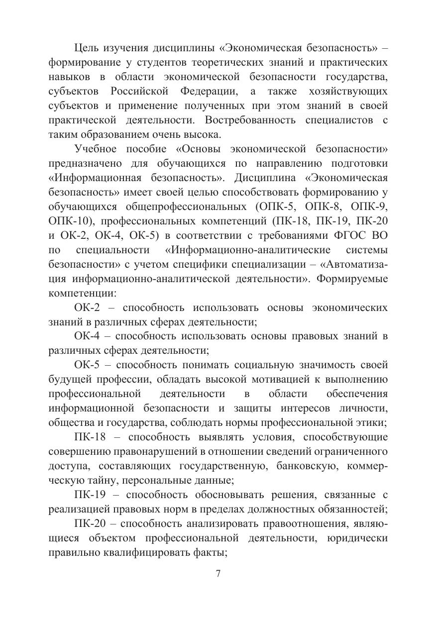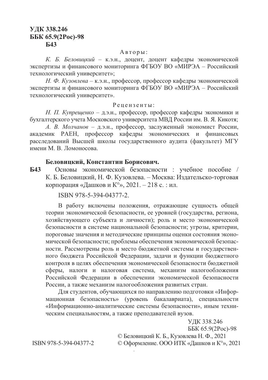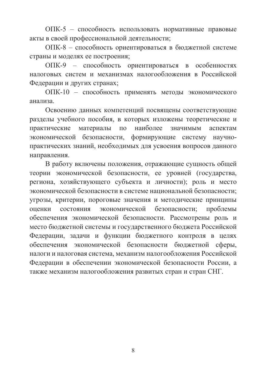 В работу включены положения, отражающие сущность общей теории экономической безопасности, ее уровней (государства, региона, хозяйствующего субъекта и личности); роль и место экономической безопасности в системе национальной безопасности; угрозы, критерии, пороговые значения и методические принципы оценки состояния экономической безопасности; проблемы обеспечения экономической безопасности. Рассмотрены роль и место бюджетной системы и государственного бюджета Российской Федерации, задачи и функции бюджетного контроля в целях обеспечения экономической безопасности бюджетной сферы, налоги и налоговая система, механизм налогообложения Российской Федерации в обеспечении экономической безопасности России, а также механизм налогообложения развитых стран.