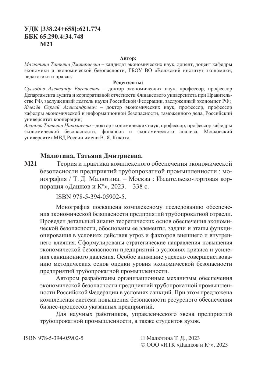 Теория и практика комплексного обеспечения экономической безопасности предприятий трубопрокатной промышленности