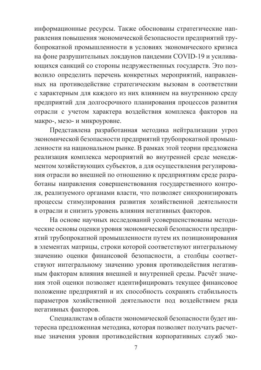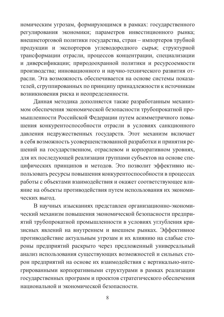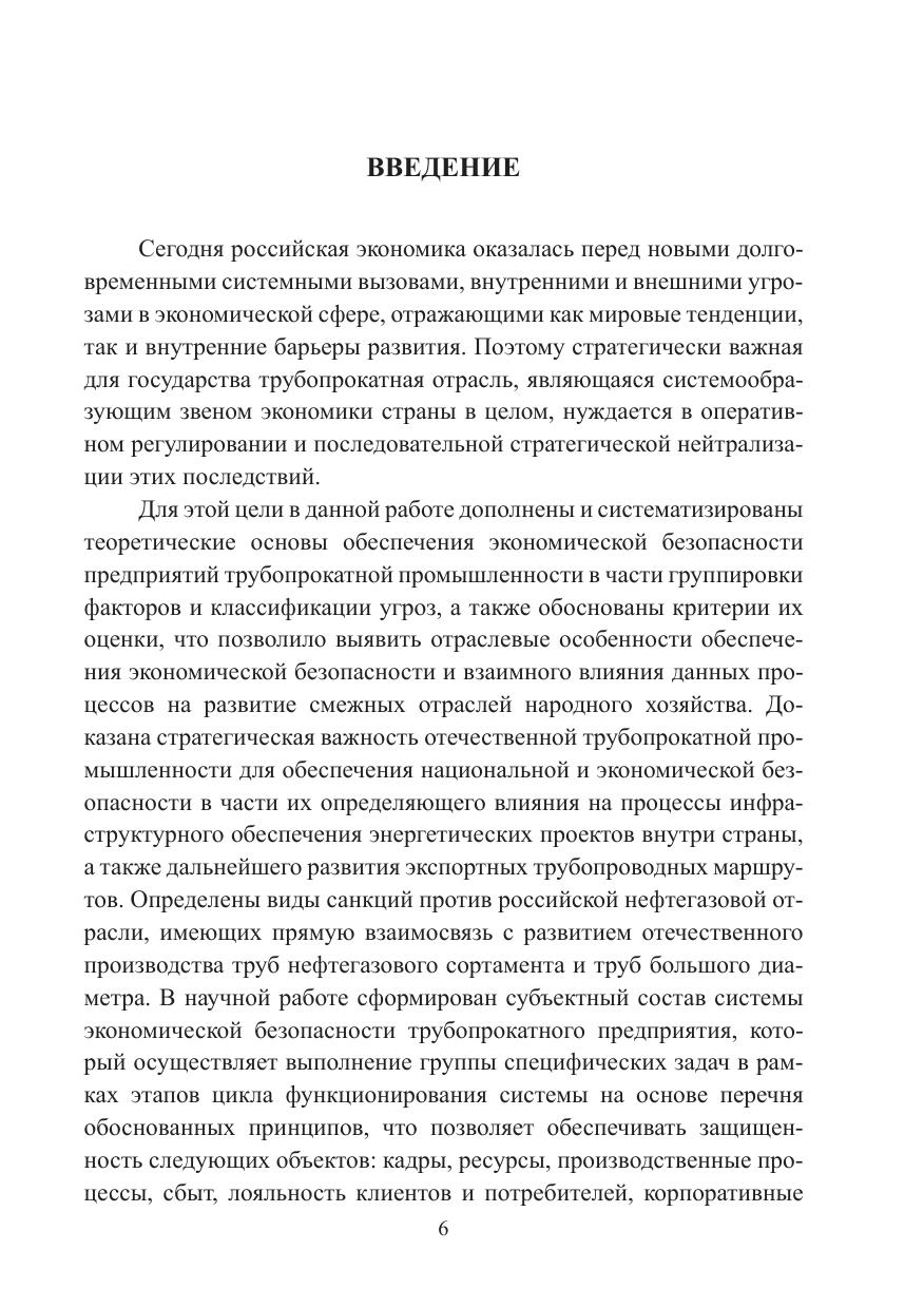 Монография посвящена комплексному исследованию обеспечения экономической безопасности предприятий трубопрокатной отрасли. Проведен детальный анализ теоретических основ обеспечения экономической безопасности, обоснованы ее элементы, задачи и этапы функционирования в условиях действия угроз и факторов внешнего и внутреннего влияния. Сформулированы стратегические направления повышения экономической безопасности предприятий в условиях кризиса и усиления санкционного давления. Особое внимание уделено совершенствованию методических основ оценки уровня экономической безопасности предприятий трубопрокатной промышленности.