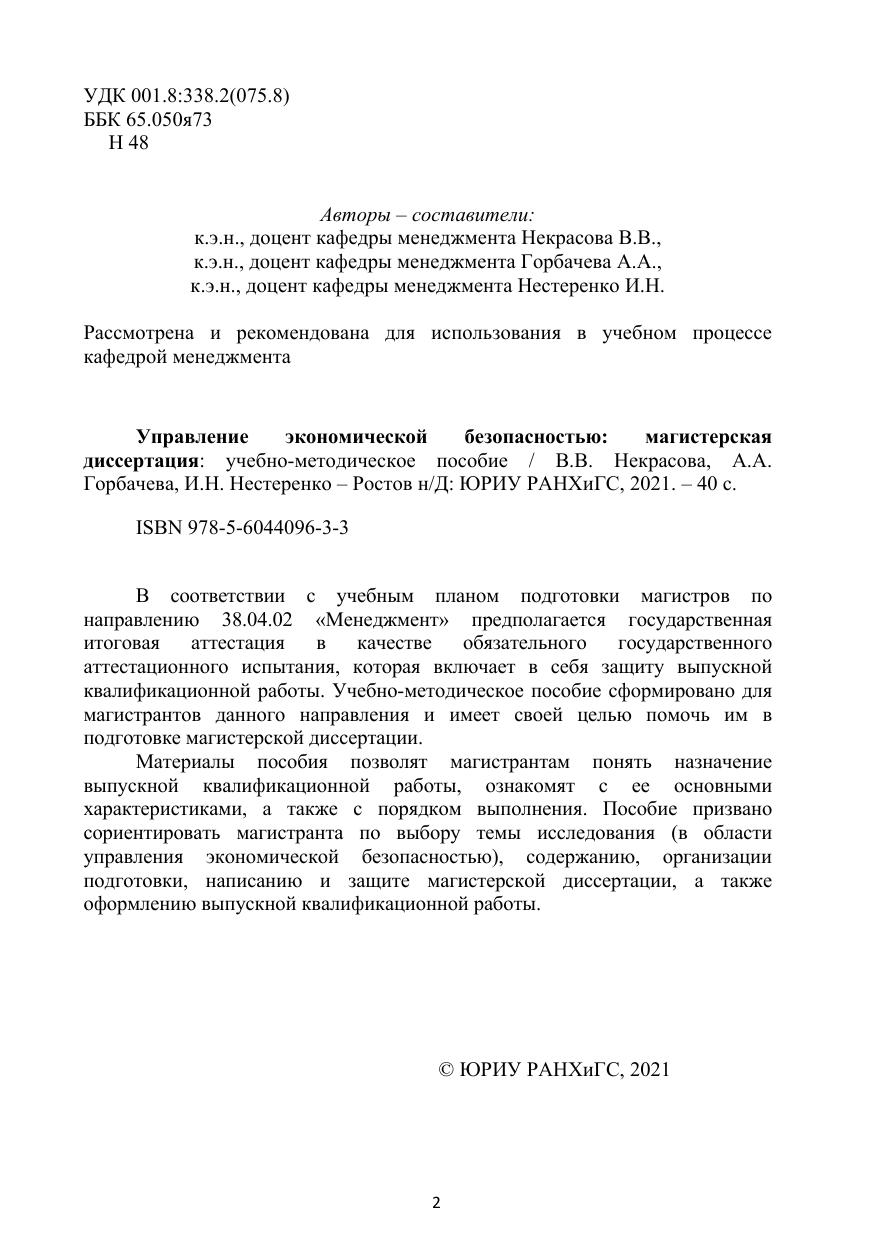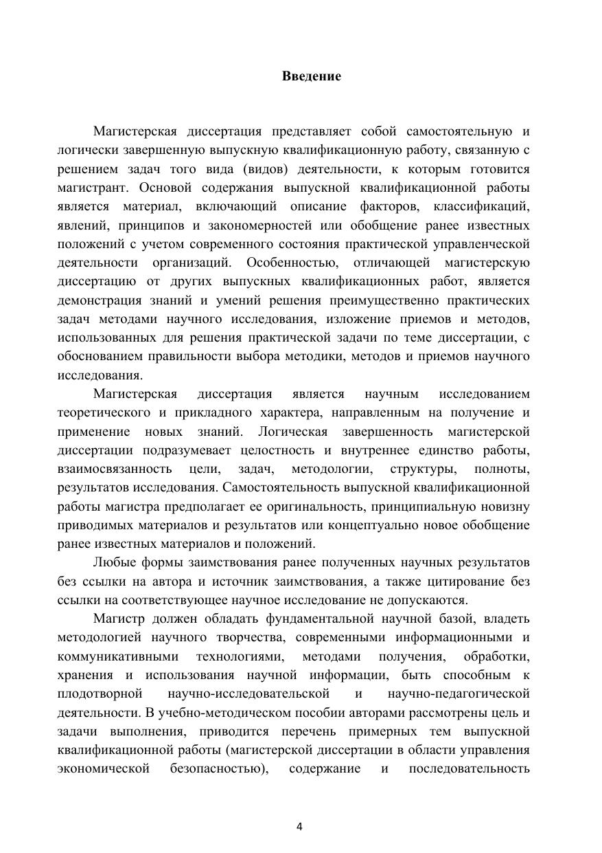 В соответствии с учебным планом подготовки магистров по направлению 38.04.02 «Менеджмент» предполагается государственная итоговая аттестация в качестве обязательного государственного аттестационного испытания, которая включает в себя защиту выпускной квалификационной работы. Учебно-методическое пособие сформировано для магистрантов данного направления и имеет своей целью помочь им в подготовке магистерской диссертации. Материалы пособия позволят магистрантам понять назначение выпускной квалификационной работы, ознакомят с ее основными характеристиками, а также с порядком выполнения. Пособие призвано сориентировать магистранта по выбору темы исследования (в области управления экономической безопасностью), содержанию, организации подготовки, написанию и защите магистерской диссертации, а также оформлению выпускной квалификационной работы.