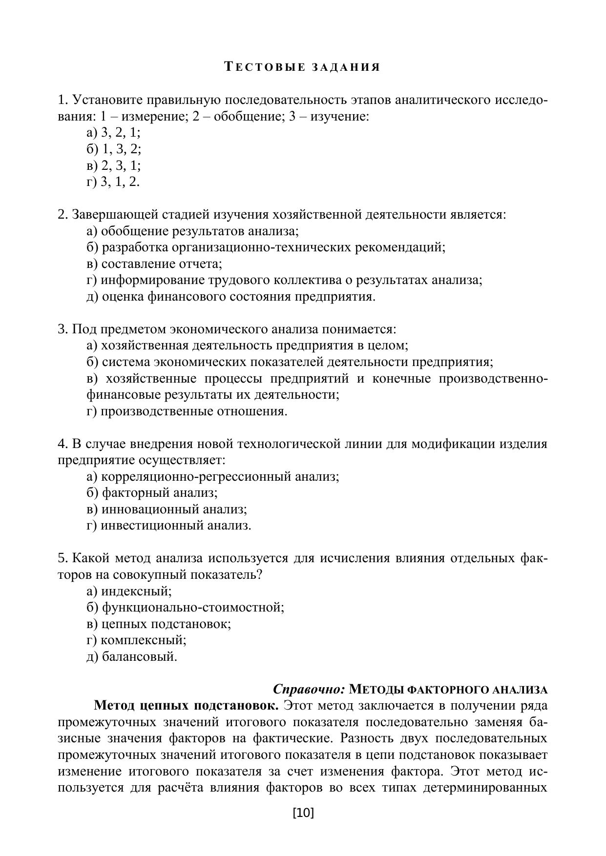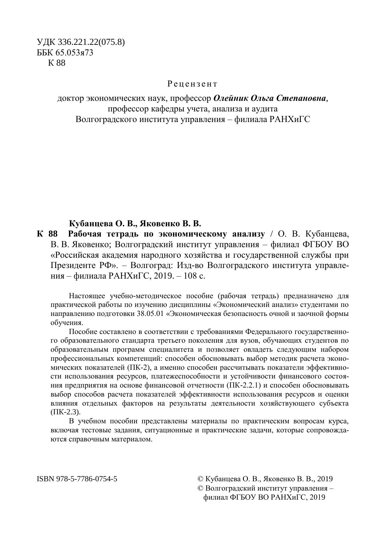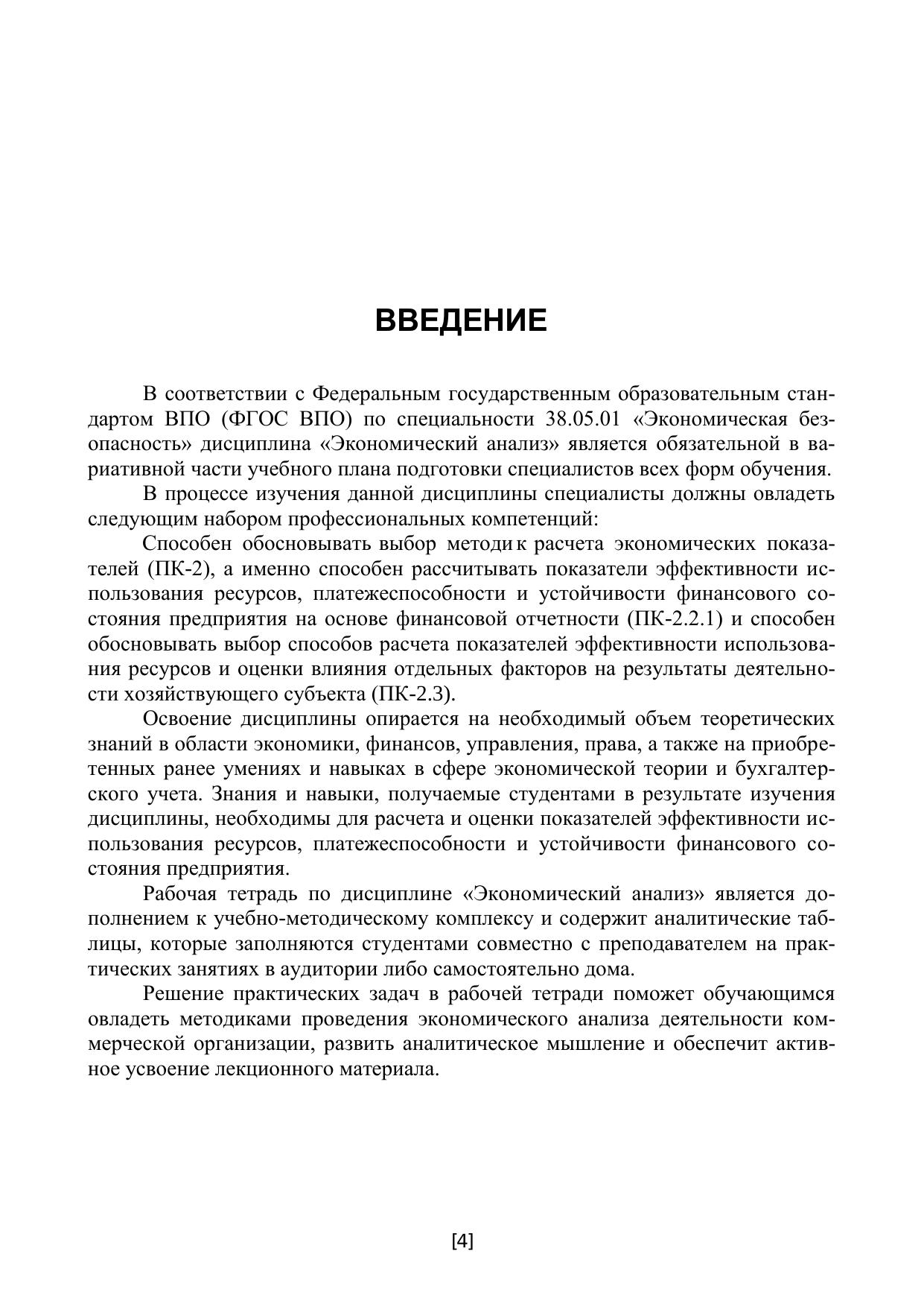 Настоящее учебно-методическое пособие (рабочая тетрадь) предназначено для практической работы по изучению дисциплины «Экономический анализ» студентами по направлению подготовки 38.05.01 «Экономическая безопасность очной и заочной формы обучения. Пособие составлено в соответствии с требованиями Федерального государственно-го образовательного стандарта третьего поколения для вузов, обучающих студентов по образовательным программ специалитета и позволяет овладеть следующим набором профессиональных компетенций: способен обосновывать выбор методик расчета эконо-мических показателей (ПК-2), а именно способен рассчитывать показатели эффективно-сти использования ресурсов, платежеспособности и устойчивости финансового состоя-ния предприятия на основе финансовой отчетности (ПК-2.2.1) и способен обосновывать выбор способов расчета показателей эффективности использования ресурсов и оценки влияния отдельных факторов на результаты деятельности хозяйствующего субъекта (ПК-2.3). В учебном пособии представлены материалы по практическим вопросам курса, включая тестовые задания, ситуационные и практические задачи, которые сопровожда-ются справочным материалом.