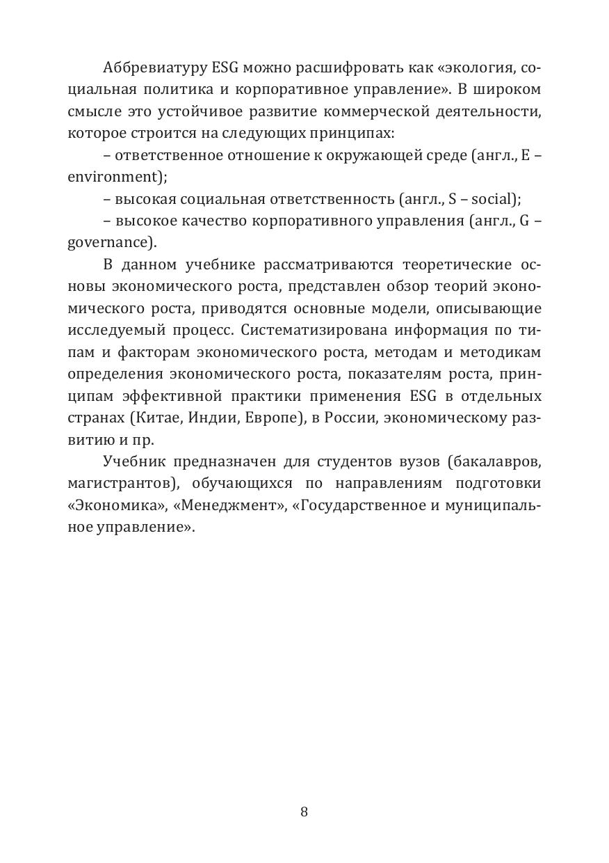 В учебнике рассматриваются теоретические основы экономического роста, представлен обзор теорий экономического роста, приводятся основные модели, описывающие исследуемый процесс. Систематизирована информация по типам и факторам экономического роста, методам и методикам определения экономического роста, показателям роста, принципам эффективной практики применения ESG в отдельных странах (Китае, Индии, Европе), в России, а также по экономическому развитию.