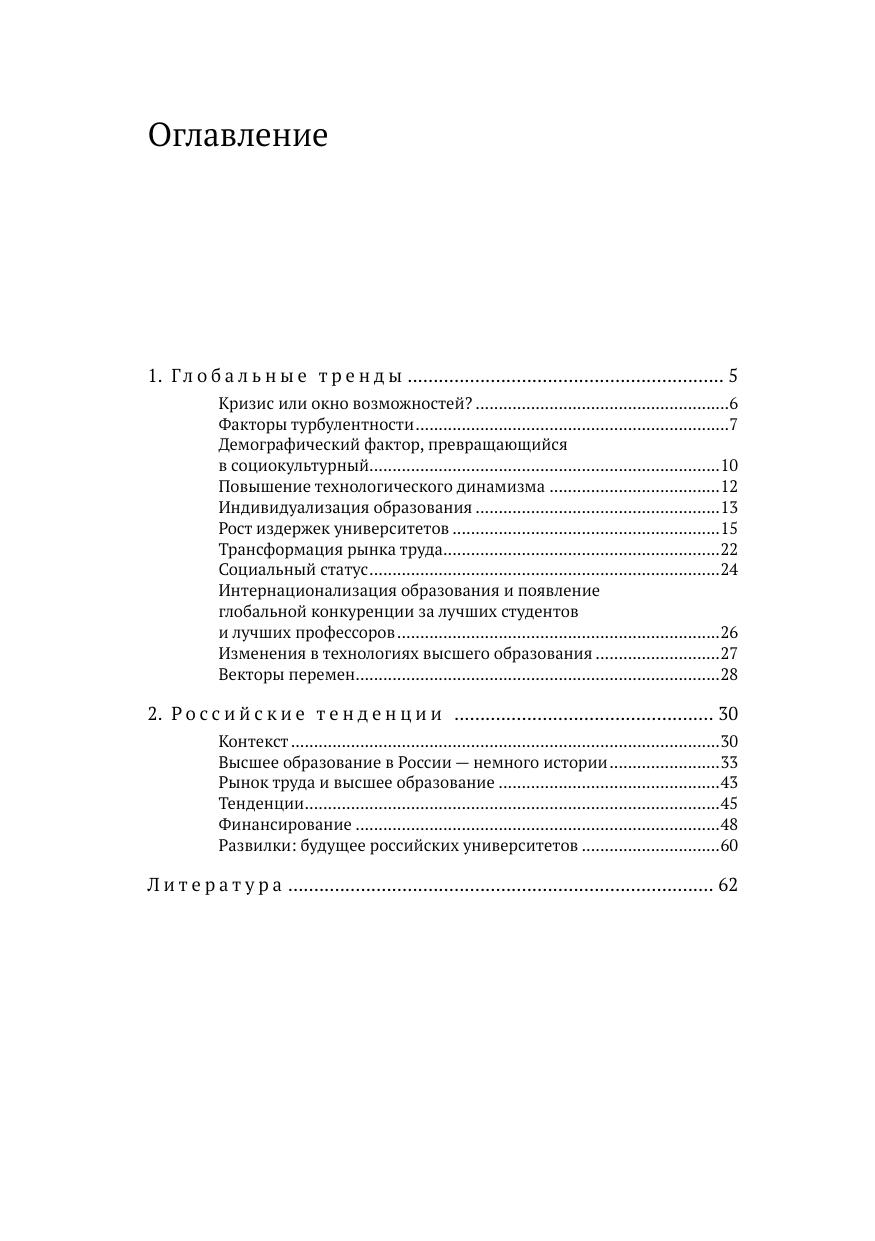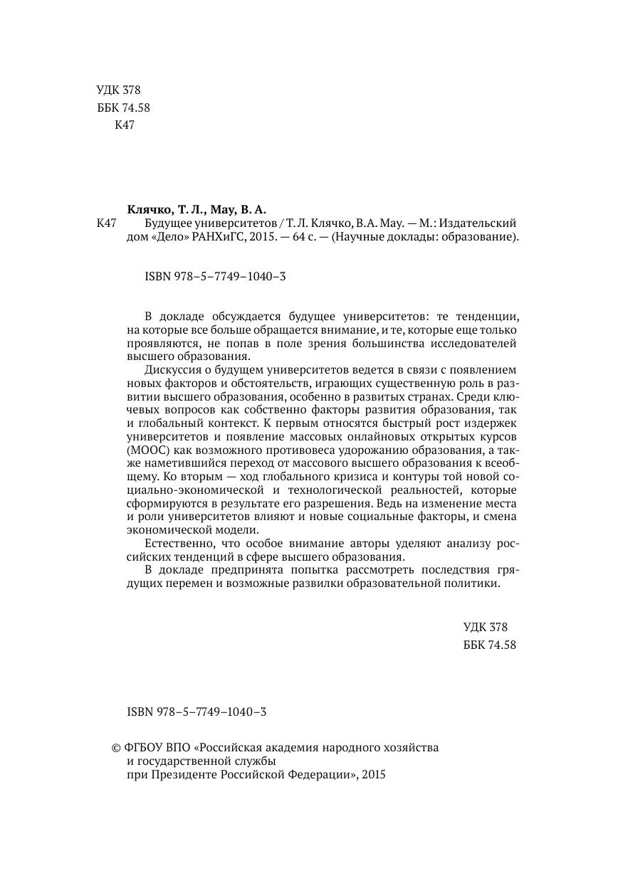 Серия Научные доклады. В докладе обсуждается будущее университетов: те тенденции, на которые все больше обращается внимание, и те, которые еще только проявляются, не попав в поле зрения большинства исследователей высшего образования. Дискуссия о будущем университетов ведется в связи с появлением новых факторов и обстоятельств, играющих существенную роль в развитии высшего образования, особенно в развитых странах. Среди ключевых вопросов как собственно факторы развития образования, так и глобальный контекст. К первым относятся быстрый рост издержек университетов и появление массовых онлайновых открытых курсов (МООС) как возможного противовеса удорожанию образования, а также наметившийся переход от массового высшего образования к всеобщему. Ко вторым — ход глобального кризиса и контуры той новой социально-экономической и технологической реальностей, которые сформируются в результате его разрешения. Ведь на изменение места и роли университетов влияют и новые социальные факторы, и смена экономической модели. Естественно, что особое внимание авторы уделяют анализу российских тенденций в сфере высшего образования. В докладе предпринята попытка рассмотреть последствия грядущих перемен и возможные развилки образовательной политики.