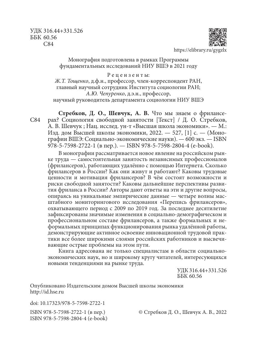 В монографии рассматривается новое явление на российском рынке труда — самостоятельная занятость независимых профессионалов (фрилансеров), работающих удалённо с помощью Интернета. Сколько фрилансеров в России? Как они живут и работают? Каковы трудовые ценности и мотивация фрилансеров? В чём состоят возможности и риски свободной занятости? Каковы дальнейшие перспективы развития фриланса в России? Авторы дают ответы на эти и другие вопросы, опираясь на уникальные эмпирические данные — четыре волны масштабного мониторингового исследования "Перепись фрилансеров", охватывающего период с 2009 по 2019 год. За последнее десятилетие зафиксированы значимые изменения в социально-демографическом и профессиональном составе фрилансеров, а также формальных и неформальных принципах функционирования рынка удалённой работы, демонстрирующие активное освоение инновационной трудовой практики все более широкими слоями российских работников и высвечивающие острые проблемы на этом пути.