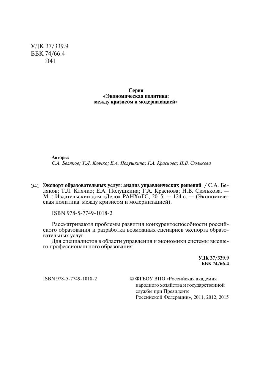 Экономическая политика: между кризисом и модернизацией. Рассматриваютя проблемы развития конкурентоспособности российского образования и разработка возможных сценариев экспорта образовательных услуг. Для специалистов в области управления и экономики системы высшего профессионального образования.