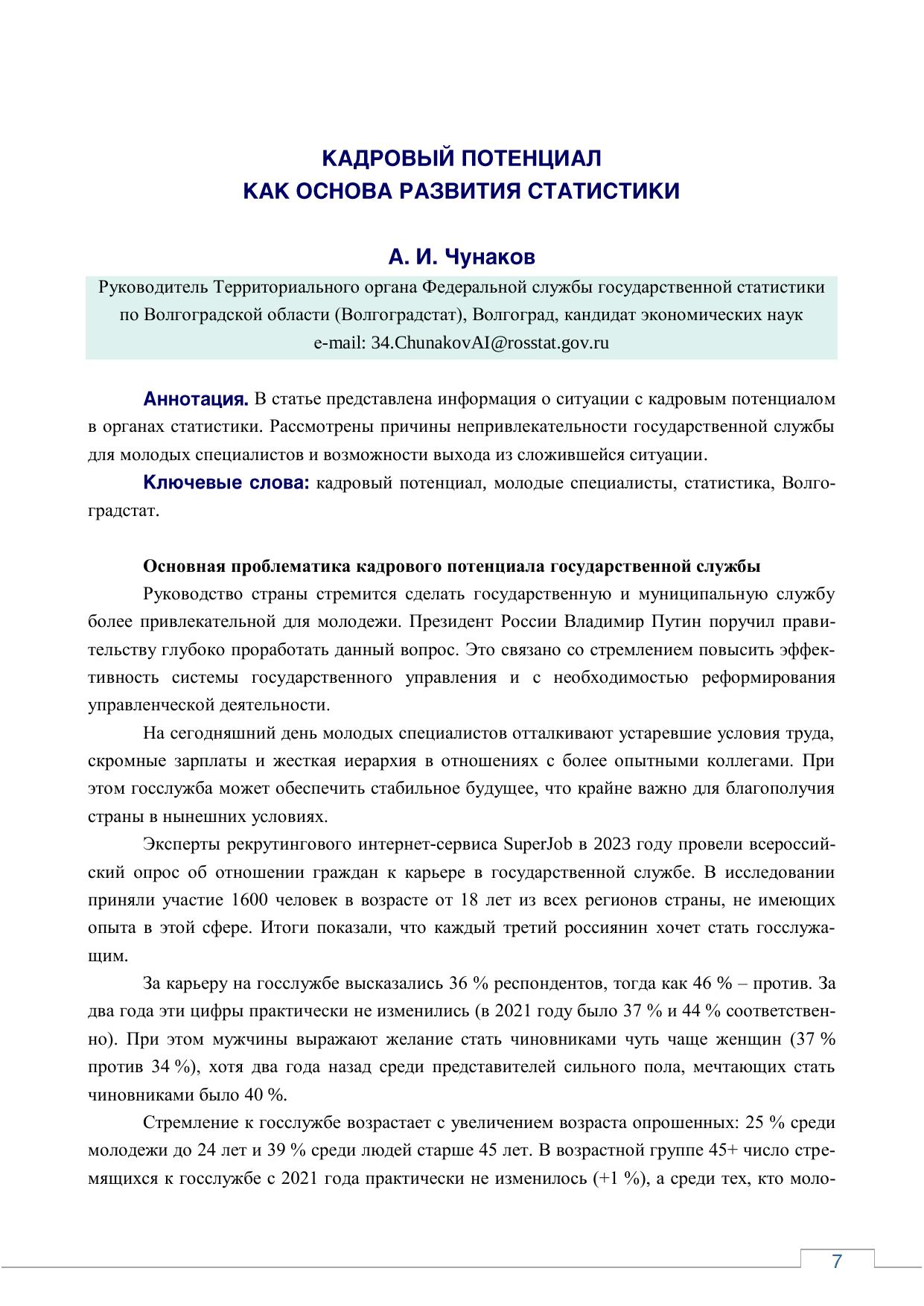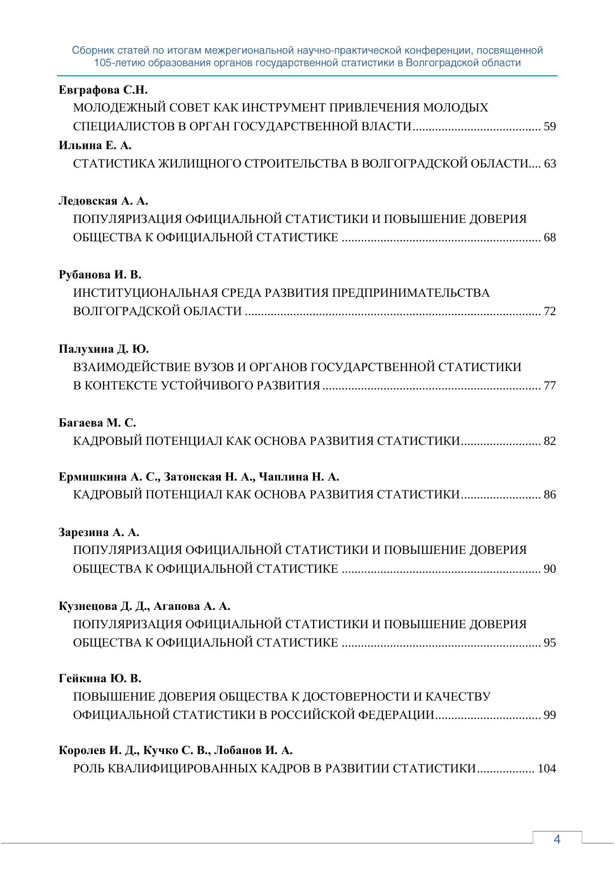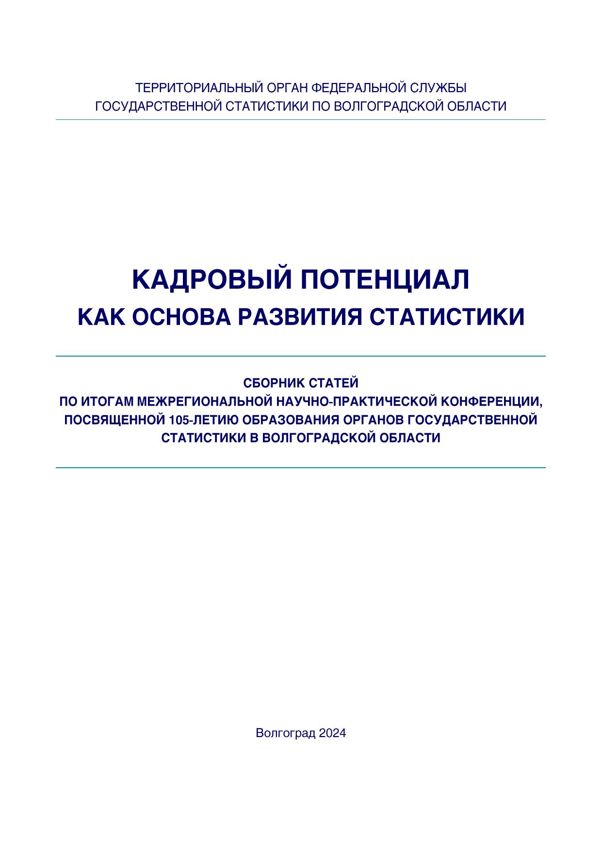 Кадровый потенциал как основа развития статистики: сборник статей по итогам межрегиональной научно-практической конференции, посвященной 105-летию образования органов государственной статистики в Волгоградской области; г. Волгоград, 2024 г.