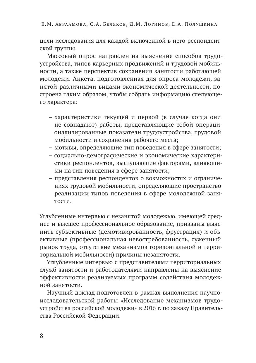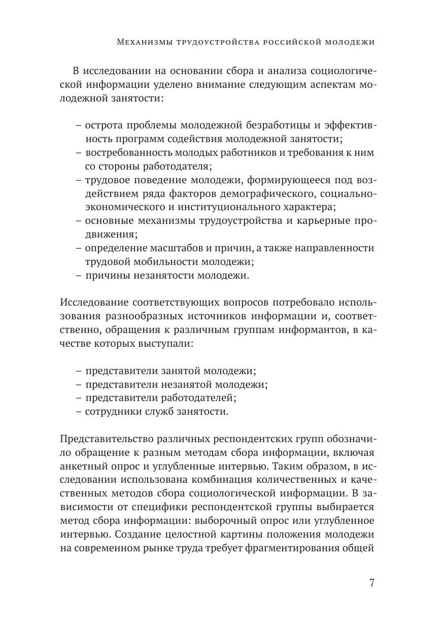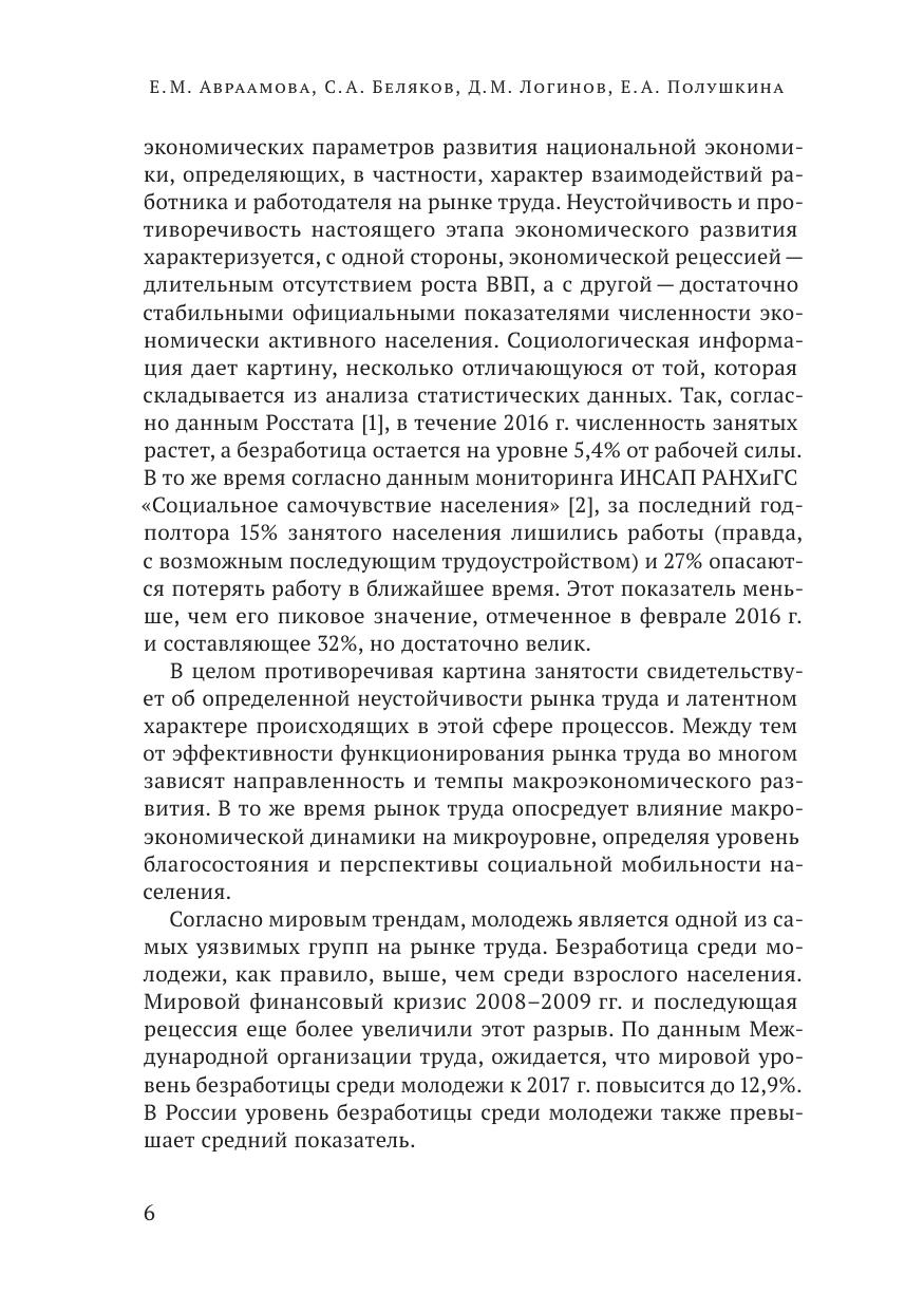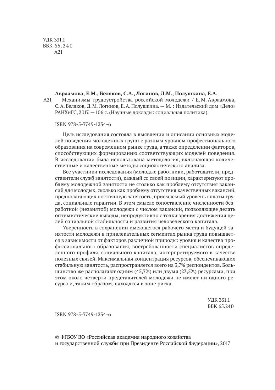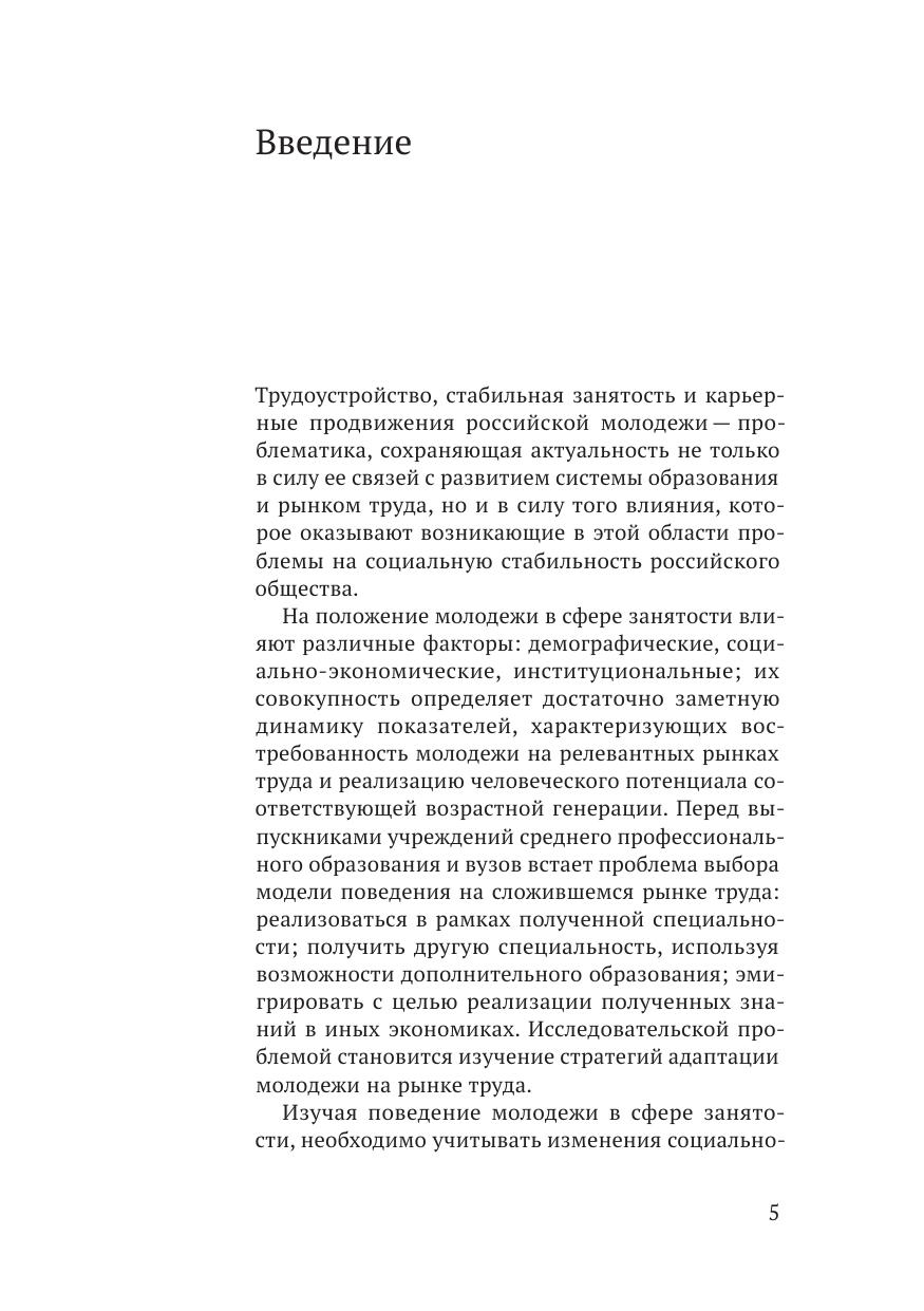 Цель исследования состояла в выявлении и описании основных моделей поведения молодежных групп с разным уровнем профессионального образования на современном рынке труда, а также определении факторов, способствующих формированию соответствующих моделей поведения. В исследовании была использована методология, включающая количественные и качественные методы социологического анализа. Все участники исследования (молодые работники, работодатели, представители служб занятости), каждый со своей позиции, характеризуют проблему молодежной занятости не столько как проблему отсутствия вакансий для молодых, сколько как проблему отсутствия качественных вакансий, предполагающих постоянную занятость, приемлемый уровень оплаты труда, социальные гарантии. В этом смысле сопоставление численности безработной (незанятой) молодежи с числом вакансий, позволяющее делать оптимистические выводы, непродуктивно с точки зрения достижения целей социальной стабильности и развития человеческого капитала. Уверенность в сохранении имеющегося рабочего места и будущей занятости молодежи в привлекательных сегментах рынка труда повышается в зависимости от факторов различной природы: уровня и качества профессионального образования, востребованности специалистов определенного профиля, социального капитала, интерпретируемого в качестве полезных связей. Максимальная концентрация ресурсов, обеспечивающих стабильную занятость, распространяется всего на 3,7% респондентов. Большинство же располагают одним (45,7%) или двумя (23,5%) ресурсами, при этом около четверти представителей молодежи не имеют ни одного ресурса и, таким образом, находятся в зоне риска.