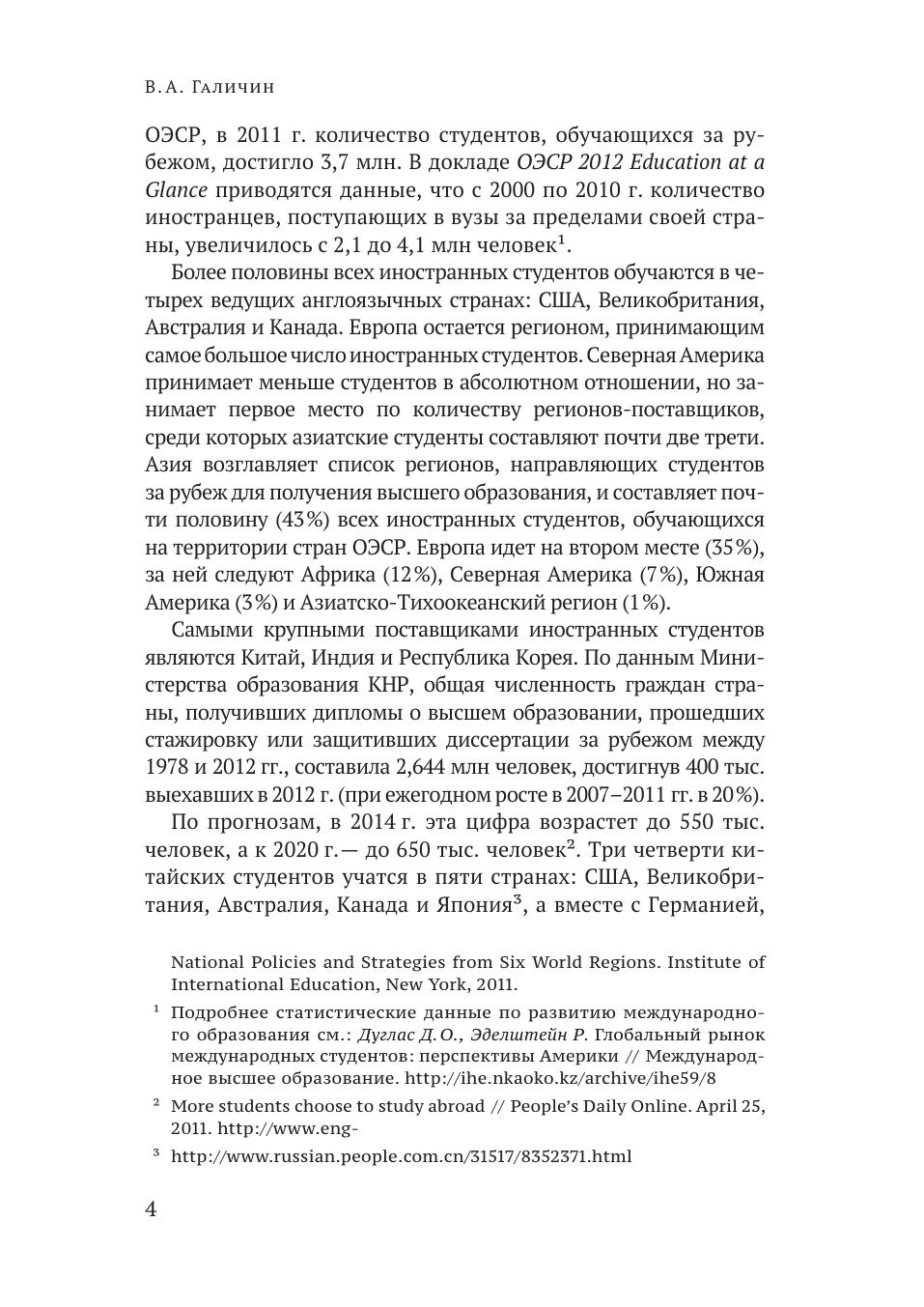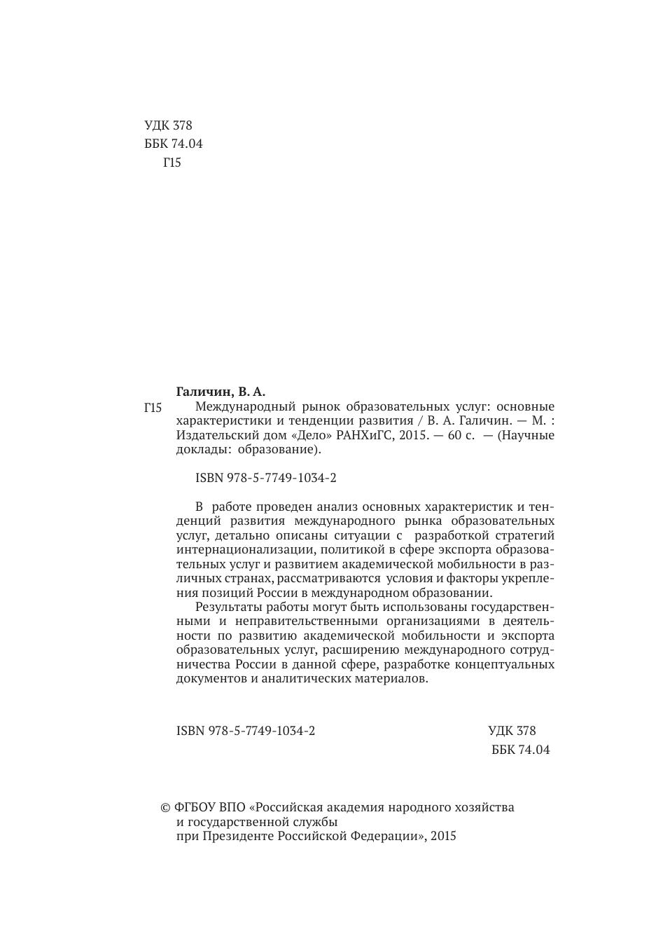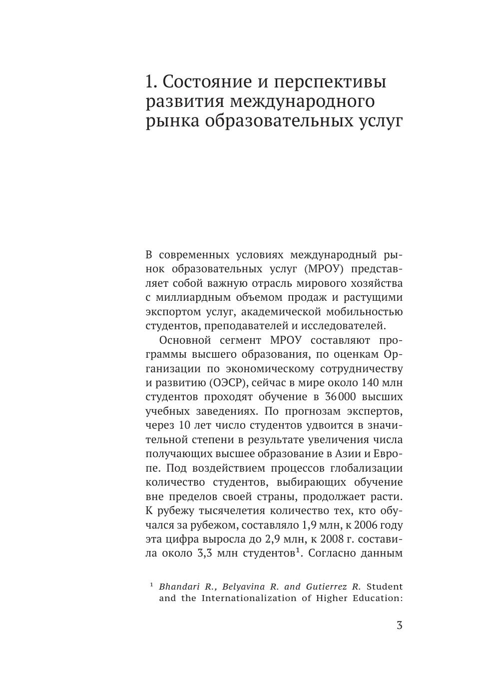 Серия Научные доклады. В работе проведен анализ основных характеристик и тенденций развития международного рынка образовательных услуг, детально описаны ситуации с разработкой стратегий интернационализации, политикой в сфере экспорта образовательных услуг и развитием академической мобильности в различных странах, рассматриваются условия и факторы укрепления позиций России в международном образовании. Результаты работы могут быть использованы государственными и неправительственными организациями в деятельности по развитию академической мобильности и экспорта образовательных услуг, расширению международного сотрудничества России в данной сфере, разработке концептуальных документов и аналитических материалов.