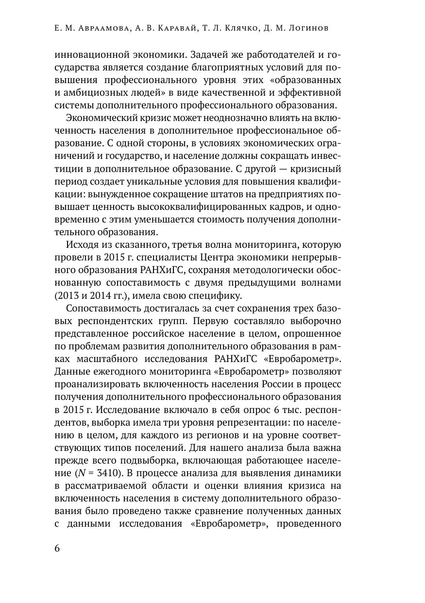 Серия Научные доклады. Доклад посвящен мониторингу дополнительного профессионального образования (ДПО) в период спада российской экономики, когда развитие человеческого и, в частности, трудового потенциала стало еще более актуальным в силу обострения межстрановой конкуренции. ДПО же является одним из важнейших инструментов повышения качества трудового потенциала. Положения мониторинга, представленные в докладе, базируются, во-первых, на ежегодных результатах исследования «Евробарометр», характеризующих включенность российского населения в сис тему ДПО, во-вторых, на данных опроса руководителей кадровых служб относительно основных проблем, задач, организационных и финансовых подходов к организации ДПО, в-третьих, на данных опроса работников предприятий, фирм и организаций относительно целей, мотивов, форм и результатов получения ДПО. Результаты опросов получены в рамках НИР «Мониторинг непрерывного профессионального образования: выявление лучших практик и особенности реализации программ повышения квалификации и переподготовки кадров по приоритетным направлениям развития экономики России» (2015), выполненного специалистами Центра экономики непрерывного образования РАНХиГС
