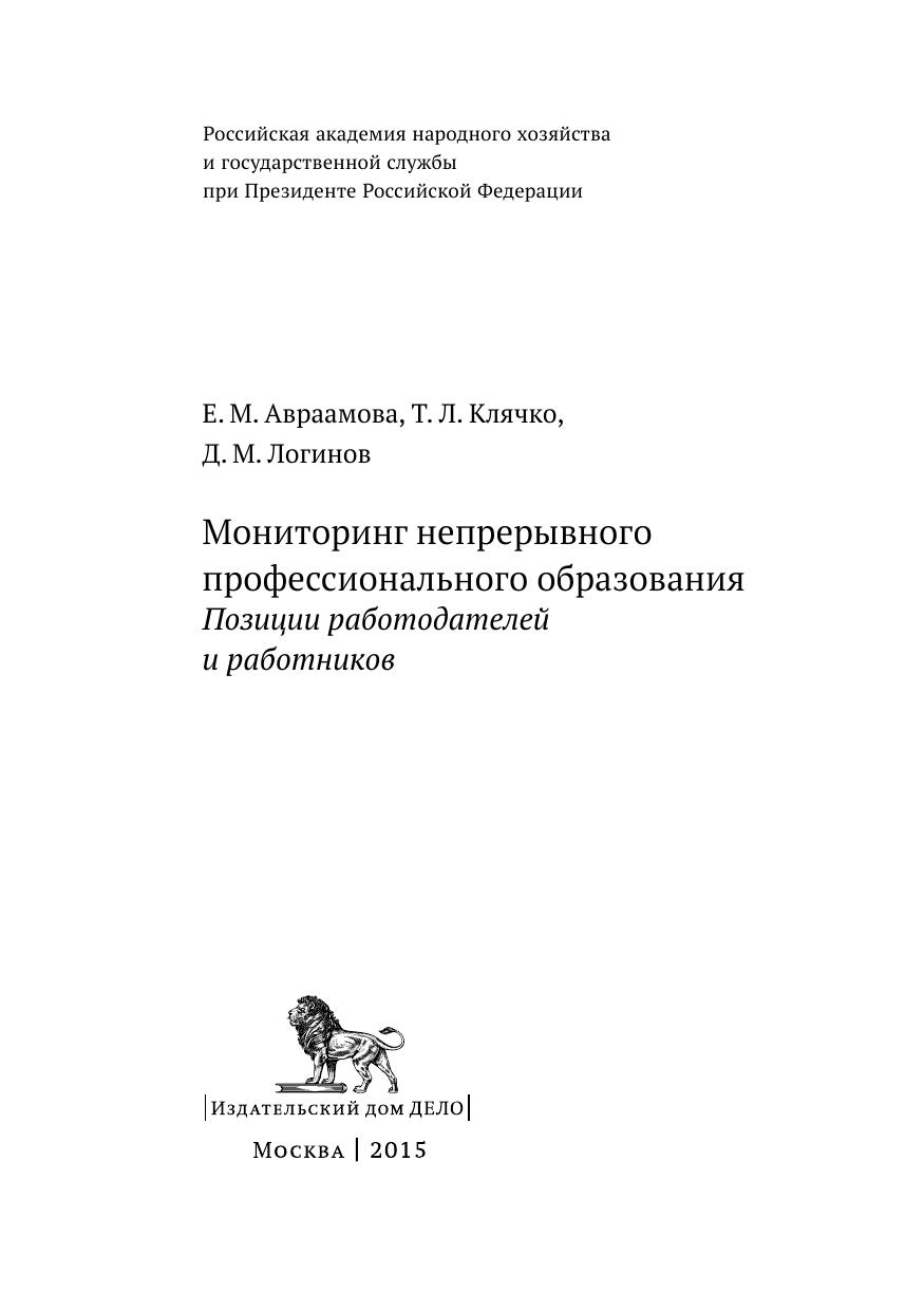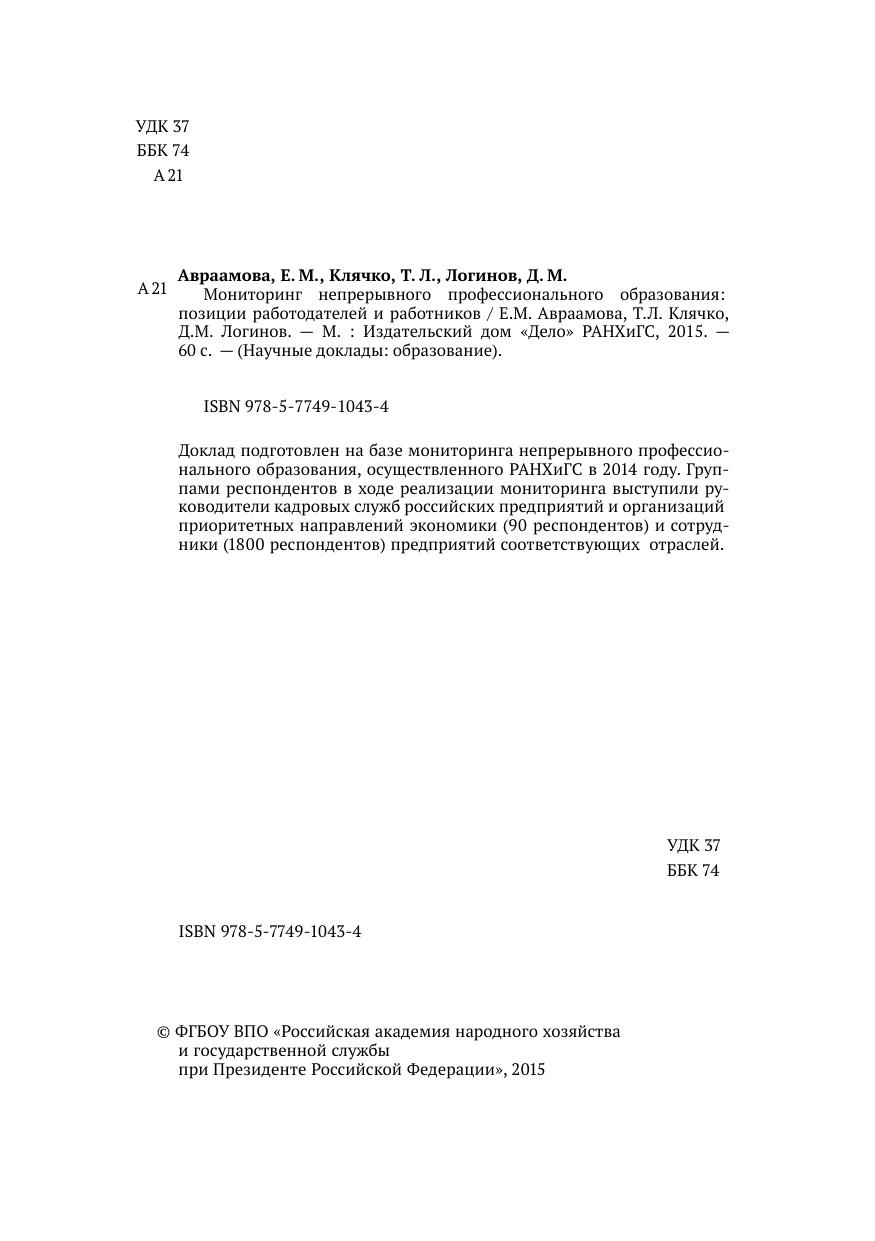 Серия Научные доклады. Доклад подготовлен на базе мониторинга непрерывного профессионального образования, осуществленного РАНХиГС в 2014 году. Группами респондентов в ходе реализации мониторинга выступили руководители кадровых служб российских предприятий и организаций приоритетных направлений экономики (90 респондентов) и сотрудники (1800 респондентов) предприятий соответствующих отраслей