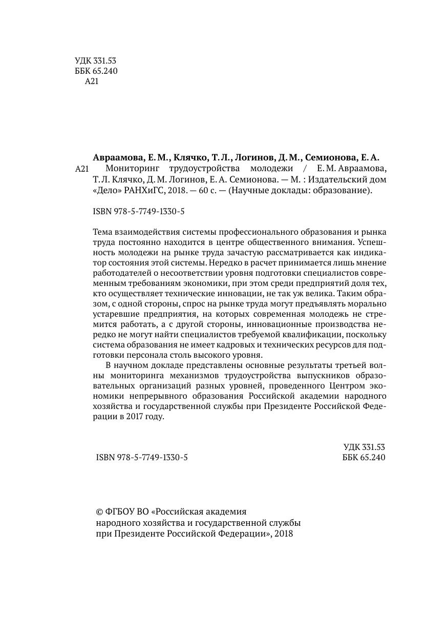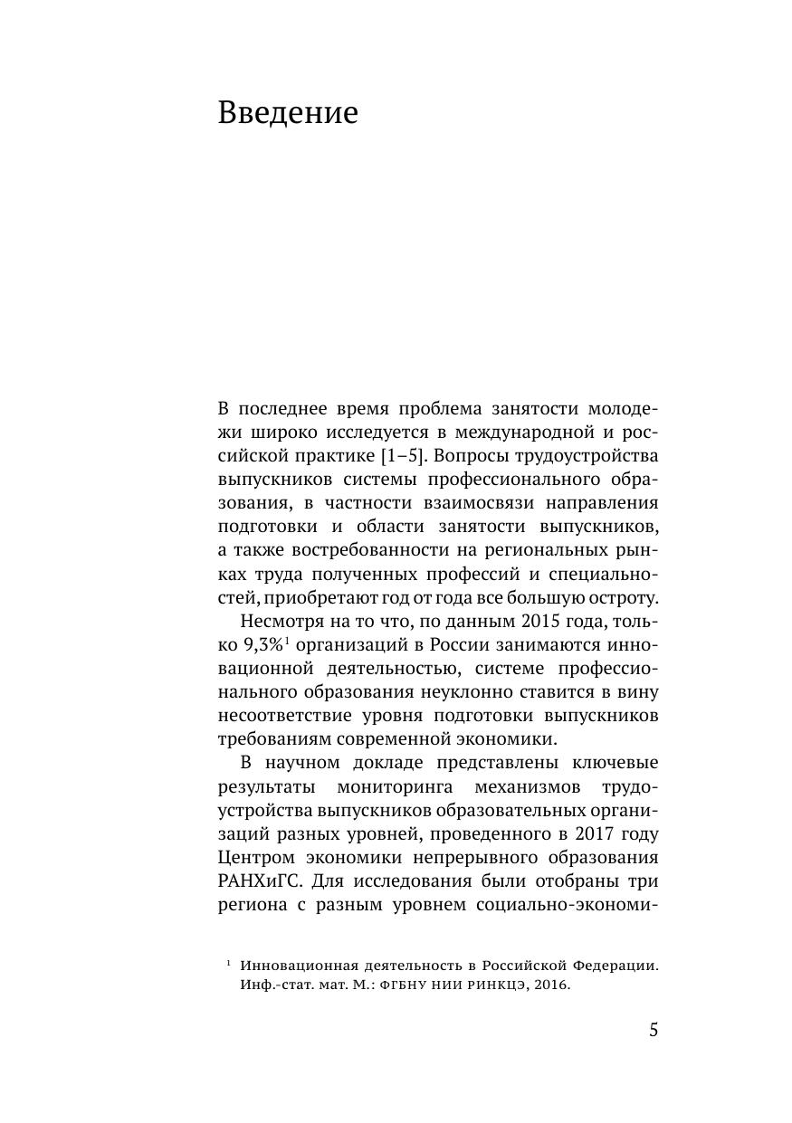 Тема взаимодействия системы профессионального образования и рынка труда постоянно находится в центре общественного внимания. Успешность молодежи на рынке труда зачастую рассматривается как индикатор состояния этой системы. Нередко в расчет принимается лишь мнение работодателей о несоответствии уровня подготовки специалистов современным требованиям экономики, при этом среди предприятий доля тех, кто осуществляет технические инновации, не так уж велика. Таким образом, с одной стороны, спрос на рынке труда могут предъявлять морально устаревшие предприятия, на которых современная молодежь не стремится работать, а с другой стороны, инновационные производства нередко не могут найти специалистов требуемой квалификации, поскольку система образования не имеет кадровых и технических ресурсов для подготовки персонала столь высокого уровня. В научном докладе представлены основные результаты третьей волны мониторинга механизмов трудоустройства выпускников образовательных организаций разных уровней, проведенного Центром экономики непрерывного образования Российской академии народного хозяйства и государственной службы при Президенте Российской Федерации в 2017 году.
