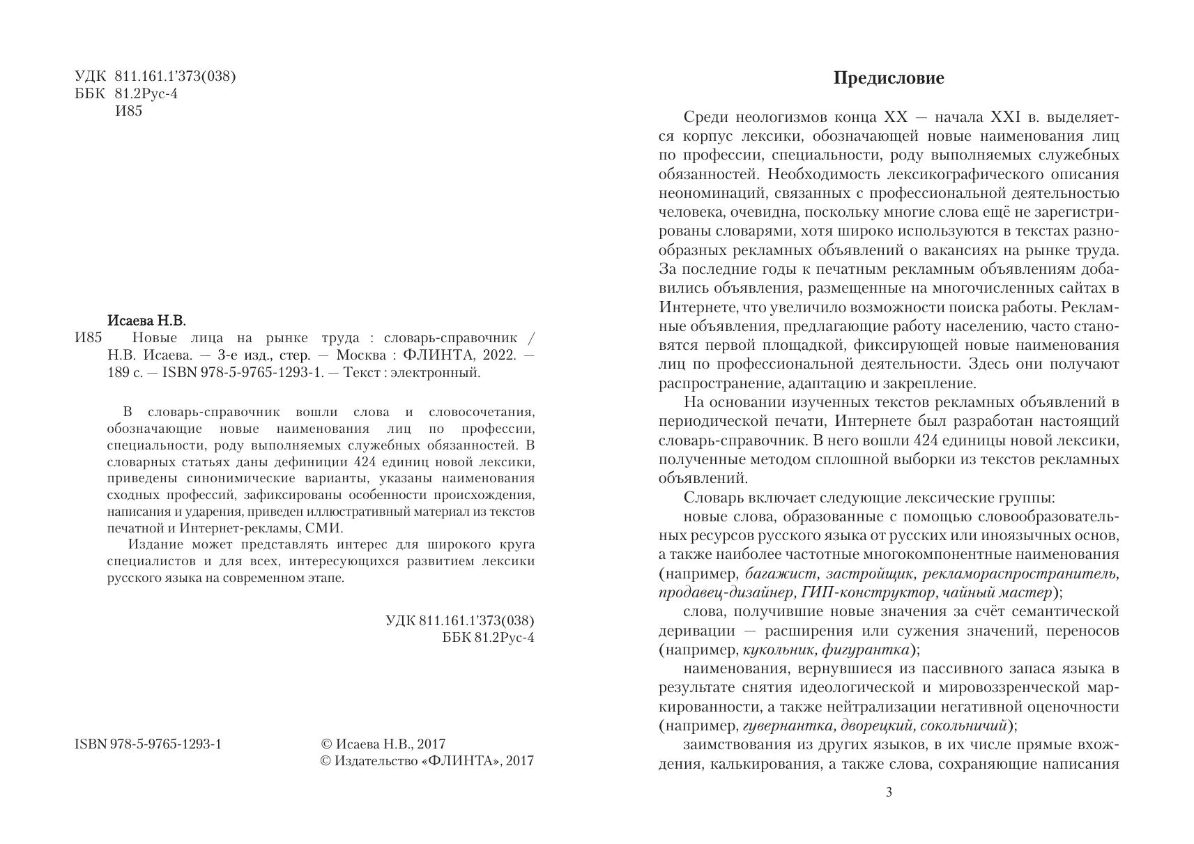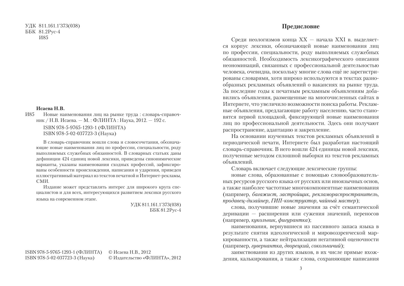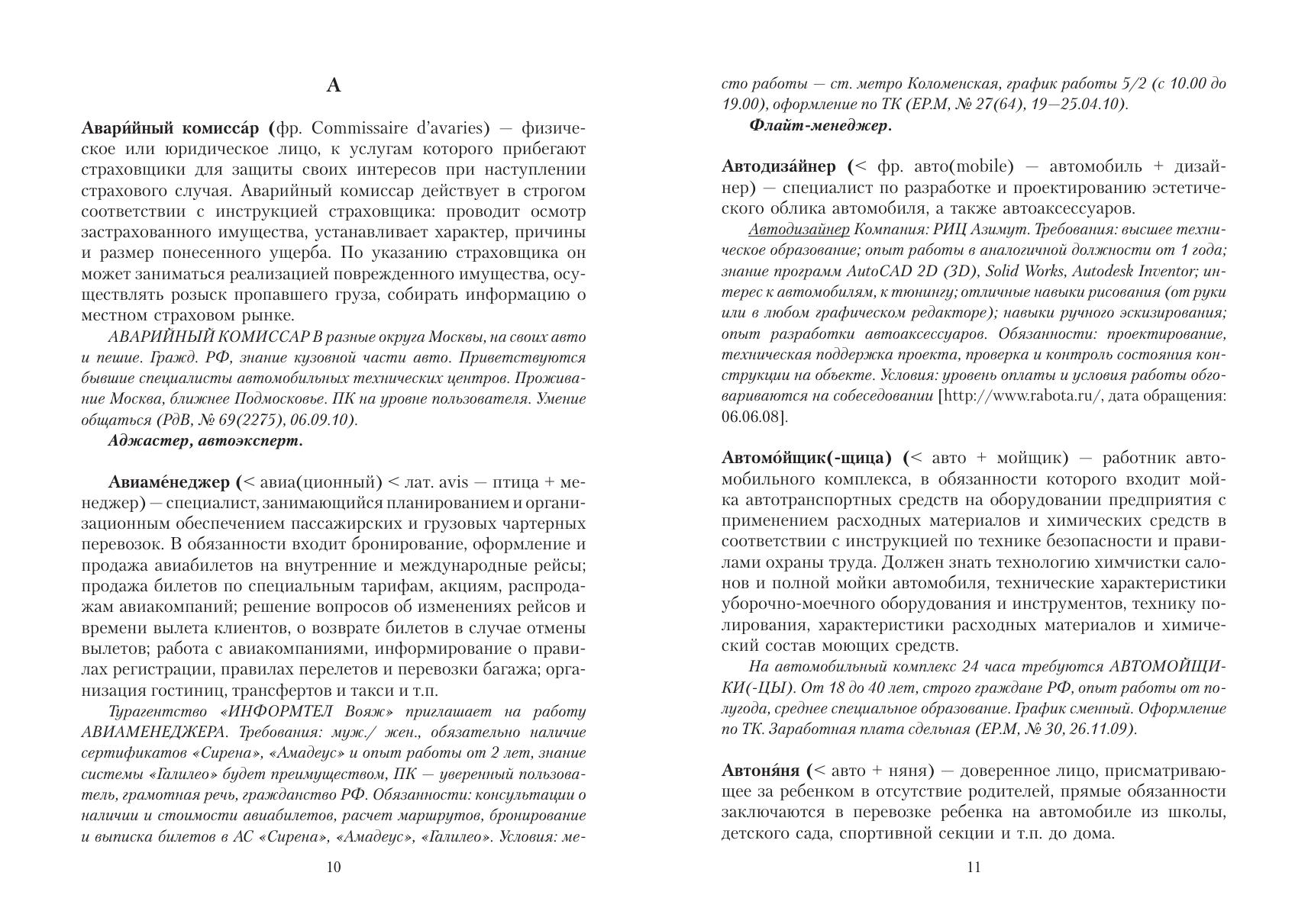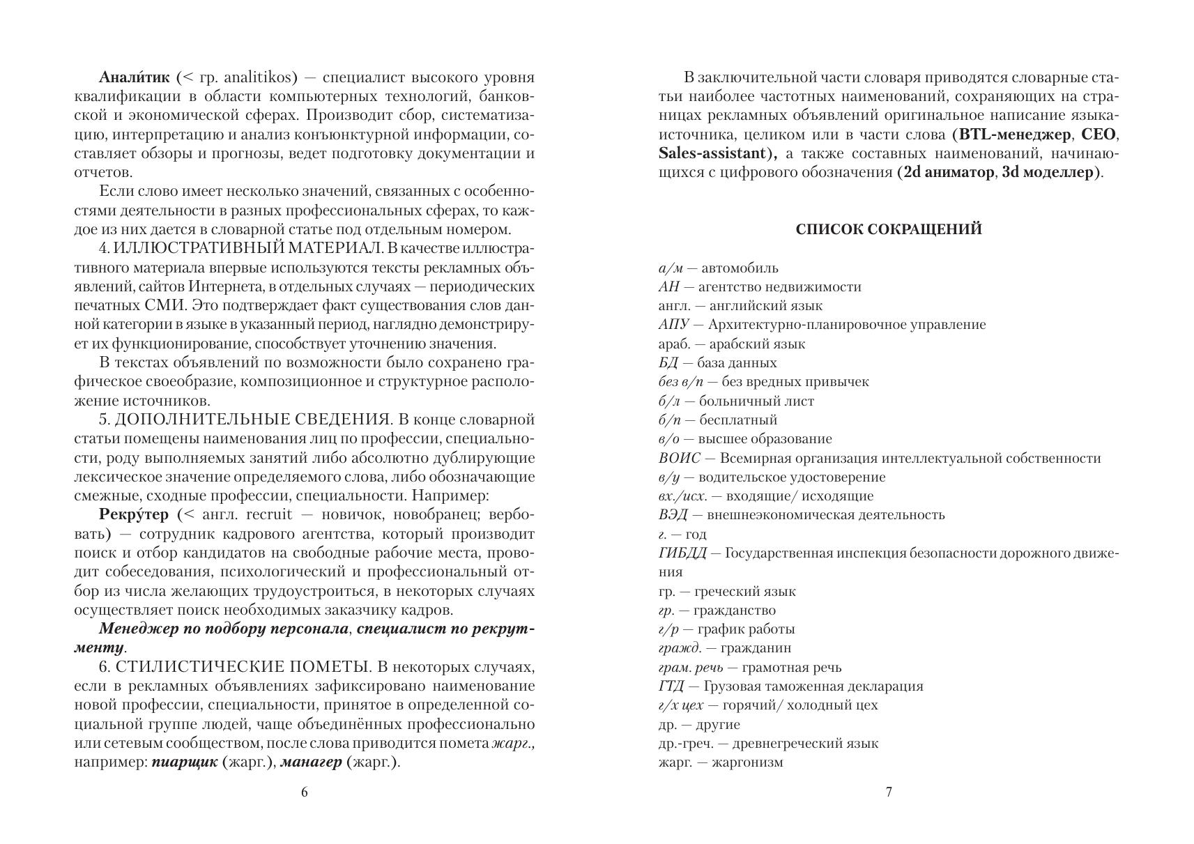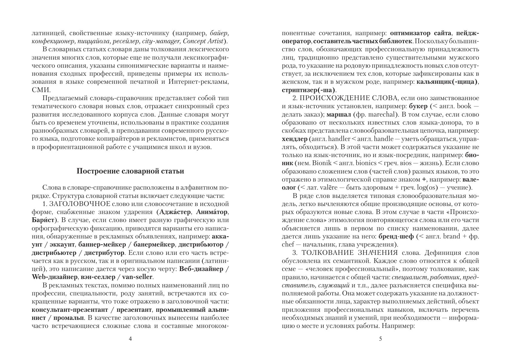В словарь-справочник вошли слова и словосочетания, обозначающие новые наименования лиц по профессии, специальности, роду выполняемых служебных обязанностей. В словарных статьях даны дефиниции 424 единиц новой лексики, приведены синонимические варианты, указаны наименования сходных профессий, зафиксированы особенности происхождения, написания и ударения, приведен иллюстративный материал из текстов печатной и Интернет-рекламы, СМИ.