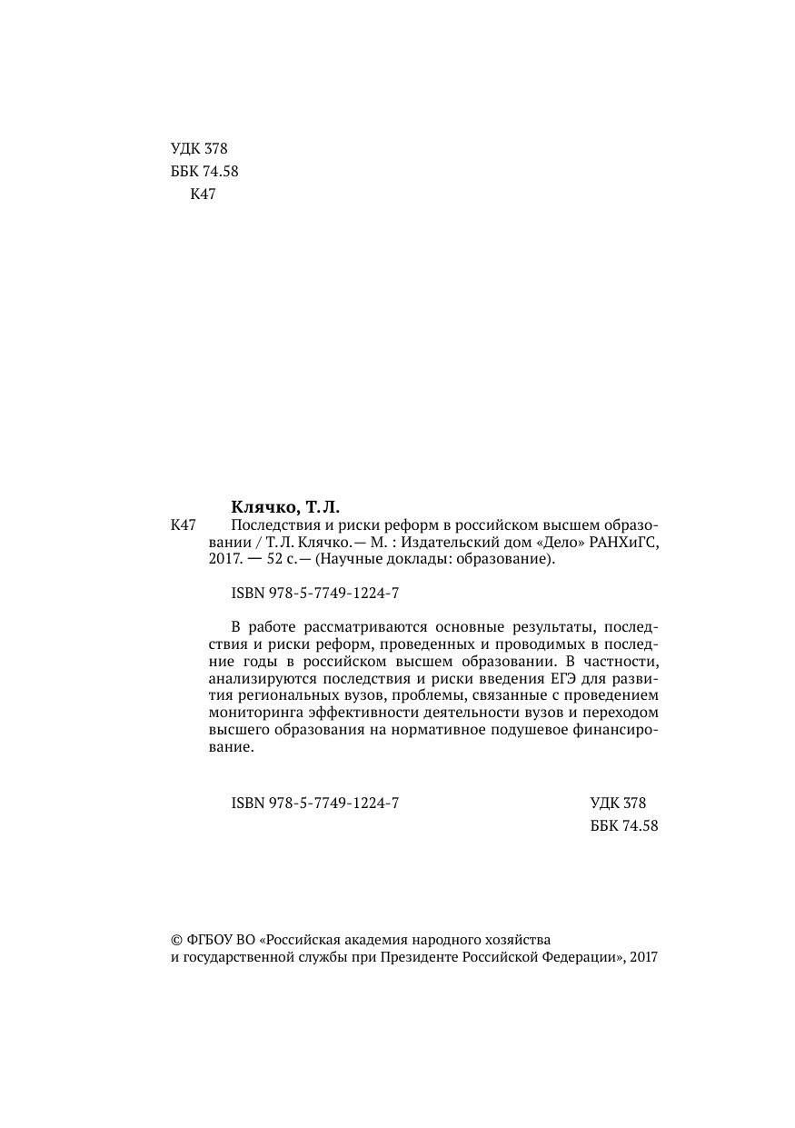 В работе рассматриваются основные результаты, последствия и риски реформ, проведенных и проводимых в последние годы в российском высшем образовании. В частности, анализируются последствия и риски введения ЕГЭ для развития региональных вузов, проблемы, связанные с проведением мониторинга эффективности деятельности вузов и переходом высшего образования на нормативное подушевое финансирование.