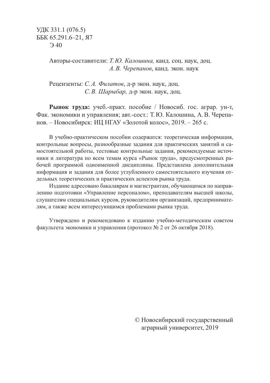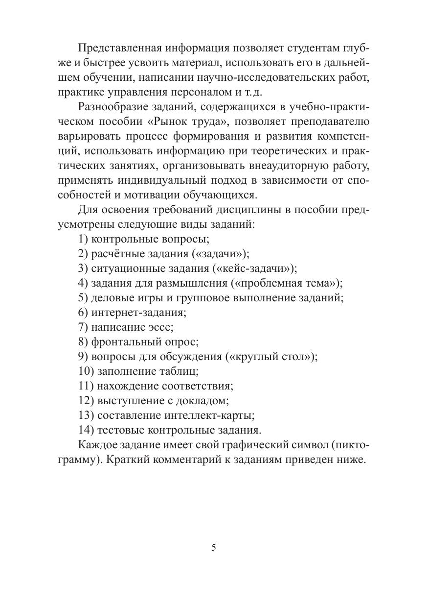 В учебно-практическом пособии содержатся: теоретическая информация, контрольные вопросы, разнообразные задания для практических занятий и самостоятельной работы, тестовые контрольные задания, рекомендуемые источники и литература по всем темам курса «Рынок труда», предусмотренных рабочей программой одноименной дисциплины. Представлена дополнительная информация и задания для более углубленного самостоятельного изучения отдельных теоретических и практических аспектов рынка труда. Издание адресовано бакалаврам и магистрантам, обучающимся по направлению подготовки «Управление персоналом», преподавателям высшей школы, слушателям специальных курсов, руководителям организаций, предпринимателям, а также всем интересующимся проблемами рынка труда. Утверждено и рекомендовано к изданию учебно-методическим советом факультета экономики и управления (протокол № 2 от 26 октября 2018).