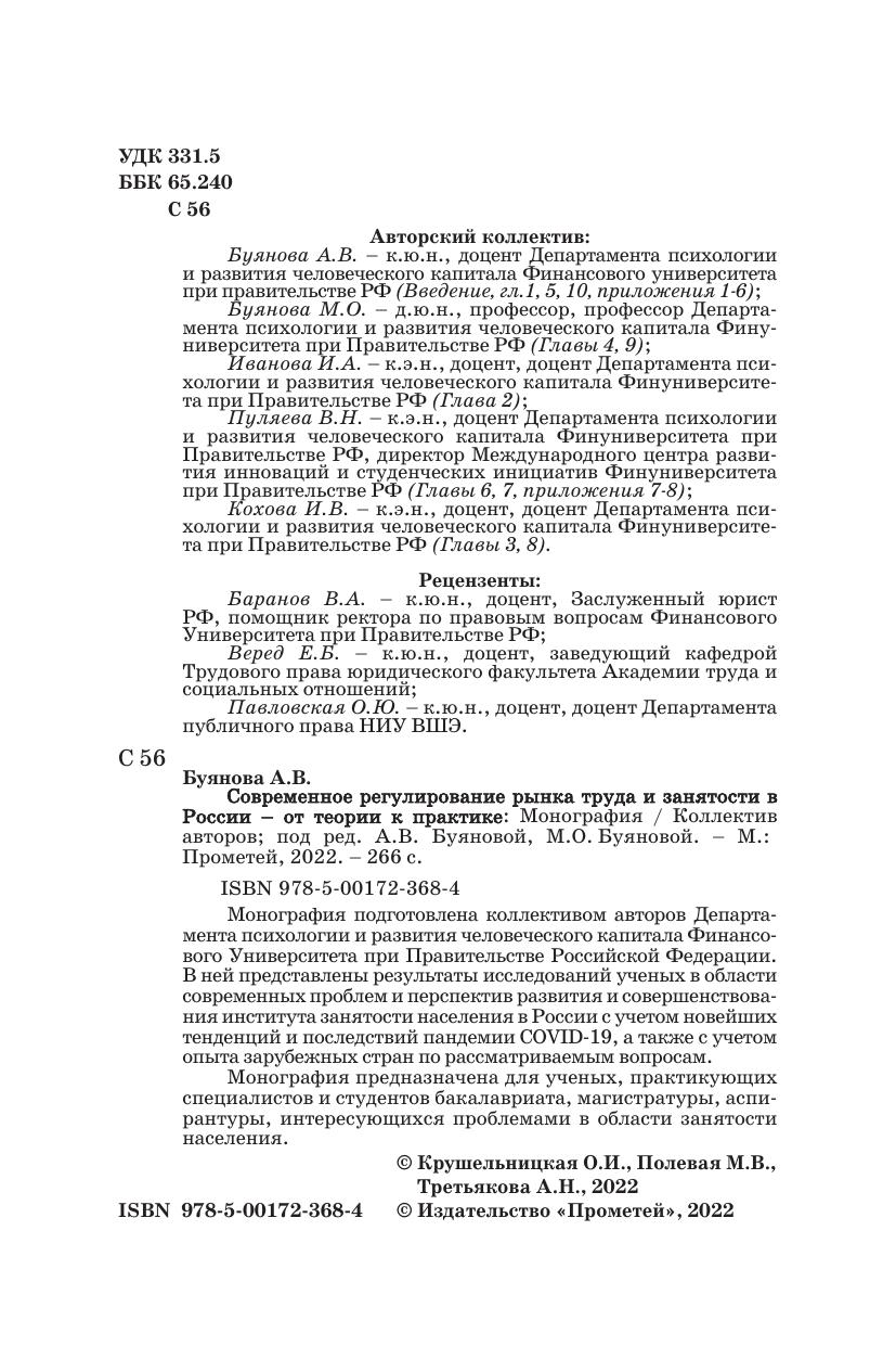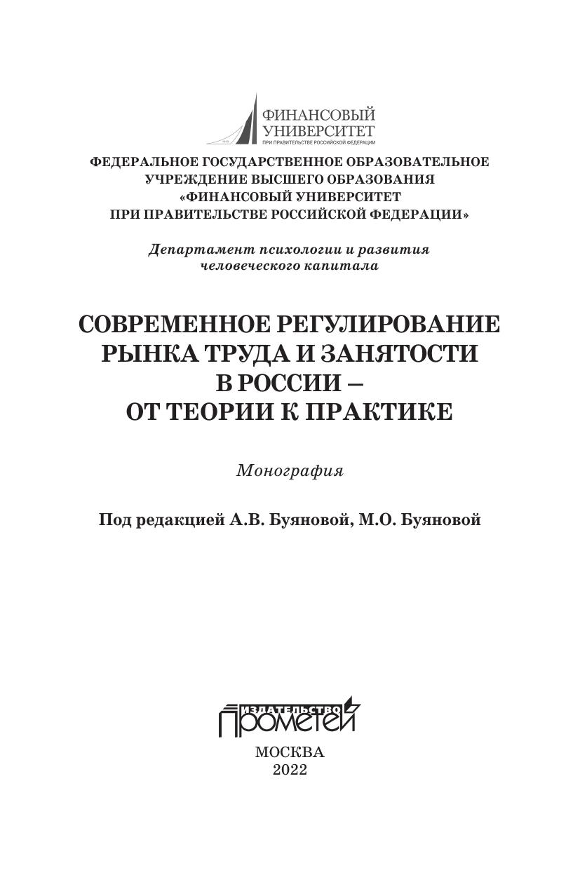 Монография подготовлена коллективом авторов Департамента психологии и развития человеческого капитала Финансового Университета при Правительстве Российской Федерации. В ней представлены результаты исследований ученых в области современных проблем и перспектив развития и совершенствования института занятости населения в России с учетом новейших тенденций и последствий пандемии COVID-19, а также с учетом опыта зарубежных стран по рассматриваемым вопросам. Монография предназначена для ученых, практикующих специалистов и студентов бакалавриата, магистратуры, аспирантуры, интересующихся проблемами в области занятости населения.