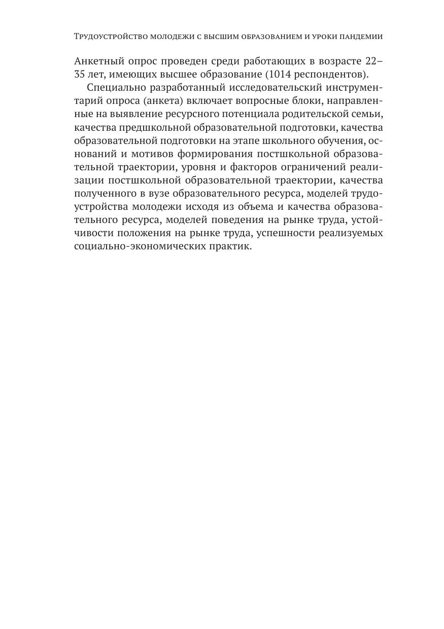 В докладе представлены результаты мониторингового исследования трудоустройства молодежи с высшим образованием, проведенного в 2020 году и захватившего первую волну пандемии коронавируса. Были рассмотрены образовательные и трудовые траектории молодежи, а также те изменения, которые внесла в эти процессы сложная эпидемиологическая ситуация. Проанализировано воздействие на выбор образовательной траектории и последующего трудоустройства молодых людей, окончивших вузы, ресурсообеспеченности родительской семьи. Показано, что ресурсообеспеченность родительской семьи хотя и оказывает существенное воздействие на поступление в престижный или обычный вуз, но попадание в престижное высшее учебное заведение не является полностью детерминированным указанным фактором, как и последующее трудоустройство.