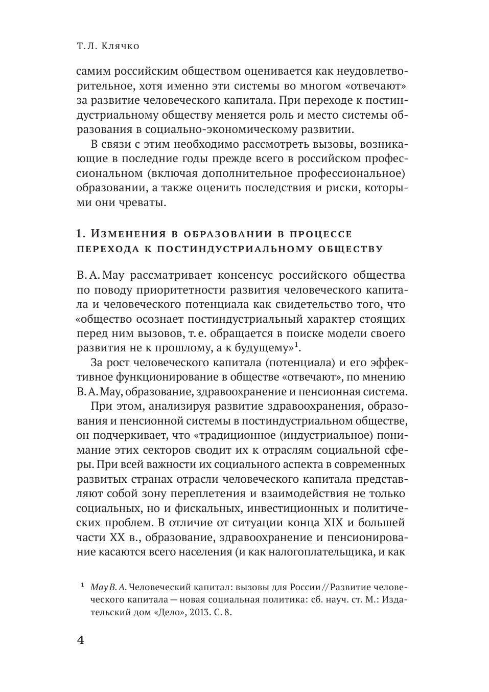 Серия Научные доклады. В докладе рассматриваются основные тенденции развития профессионального образования в Российской Федерации и те вызовы, которые сопряжены с происходящими изменениями. Большое внимание уделено анализу процессов дифференциации вузов, проблемам оценки качества профессионального образования, а также роли системы лицензирования и аккредитации в решении стоящих перед высшим образованием задач. Отдельное место занимает исследование ситуации с получением дополнительного профессионального образования. На основе материалов Росстата и мониторинга непрерывного профессионального образования, первую волну которого РАНХиГС провел в 2013 г., выявлены потребности предприятий в повышении квалификации их работников, в устранении дефицита управленческих, экономических, технических и информационно-коммуникационных компетенций персонала. Определено и отношение самих работников к получению дополнительных знаний и навыков, их заинтересованность в обучении. Позитивным моментом является то, что почти половина работников (49%) готовы вкладываться в свое образование, платить за него. Автор выражает глубокую признательность своим коллегам — Е.М. Авраамовой, С.А. Белякову, Е.А. Полушкиной, Д.М. Рогозину, которые приняли большое участие в разработке концепции мониторинга непрерывного профессионального образования и его проведении. Обсуждение с ними хода работы и полученных результатов было и полезным, и содержательно важным, позволило выделить ключевые точки анализа. Автор глубоко благодарен В.А. Мау и С.Г. Синельникову-Мурылеву, которые сделали много содержательных замечаний по тексту, а главное за то, что они инициировали данную работу.