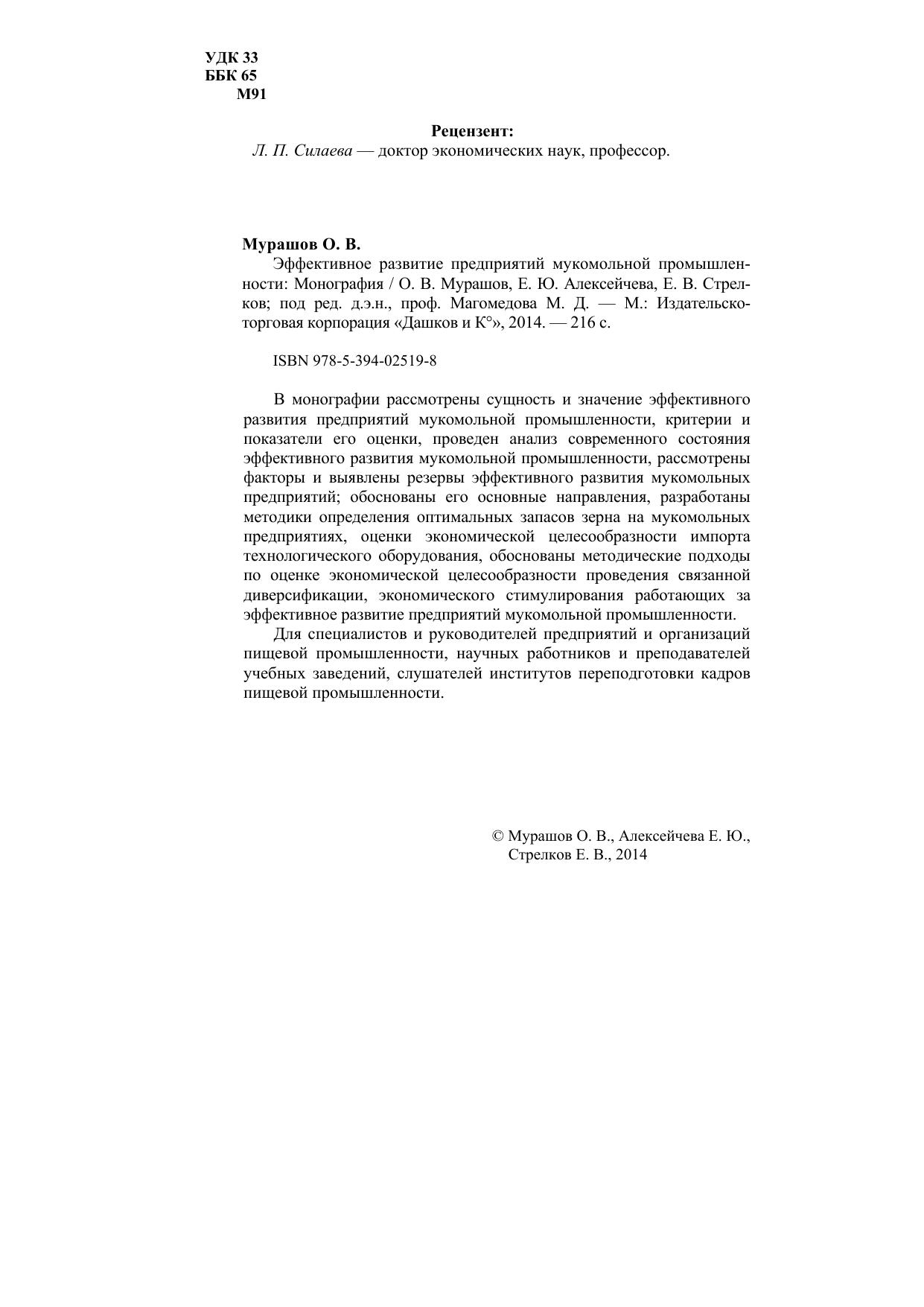 В монографии рассмотрены сущность и значение эффективного развития предприятий мукомольной промышленности, критерии и показатели его оценки, проведен анализ современного состояния эффективного развития мукомольной промышленности, рассмотрены факторы и выявлены резервы эффективного развития мукомольных предприятий; обоснованы его основные направления, разработаны методики определения оптимальных запасов зерна на мукомольных предприятиях, оценки экономической целесообразности импорта технологического оборудования, обоснованы методические подходы по оценке экономической целесообразности проведения связанной диверсификации, экономического стимулирования работающих за эффективное развитие предприятий мукомольной промышленности. Для специалистов и руководителей предприятий и организаций пищевой промышленности, научных работников и преподавателей учебных заведений, слушателей институтов переподготовки кадров пищевой промышленности.