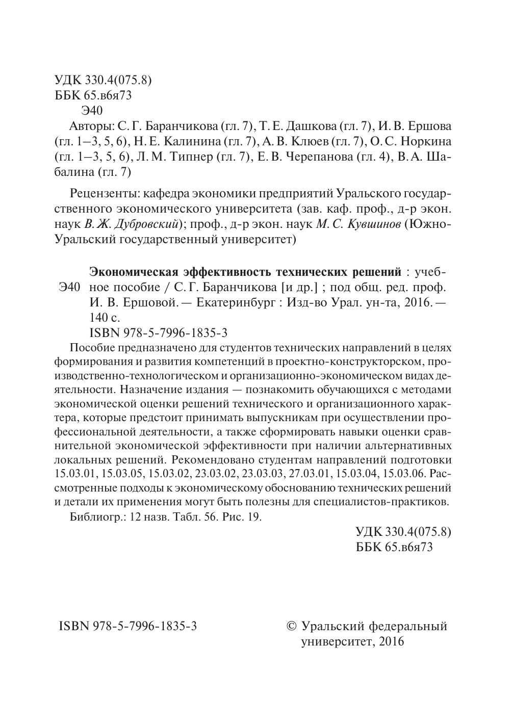 Пособие предназначено для студентов технических направлений в целях формирования и развития компетенций в проектно-конструкторском, производственно-технологическом и организационно-экономическом видах деятельности. Назначение издания — познакомить обучающихся с методами экономической оценки решений технического и организационного характера, которые предстоит принимать выпускникам при осуществлении профессиональной деятельности, а также сформировать навыки оценки сравнительной экономической эффективности при наличии альтернативных локальных решений. Рекомендовано студентам направлений подготовки 15.03.01, 15.03.05, 15.03.02, 23.03.02, 23.03.03, 27.03.01, 15.03.04, 15.03.06. Рассмотренные подходы к экономическому обоснованию технических решений и детали их применения могут быть полезны для специалистов-практиков.