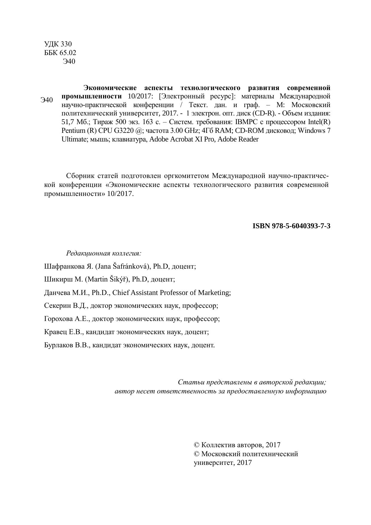 Сборник статей подготовлен оргкомитетом Международной научно-практической конференции «Экономические аспекты технологического развития современной